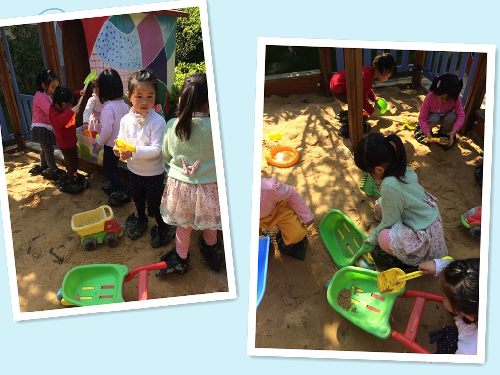 虽然铲小沙子有点累,但是我们都能坚持把小车装满才运走哦!玩得真开心啊,老师表扬我们运沙运的好,还说下次再带我们来玩呢!