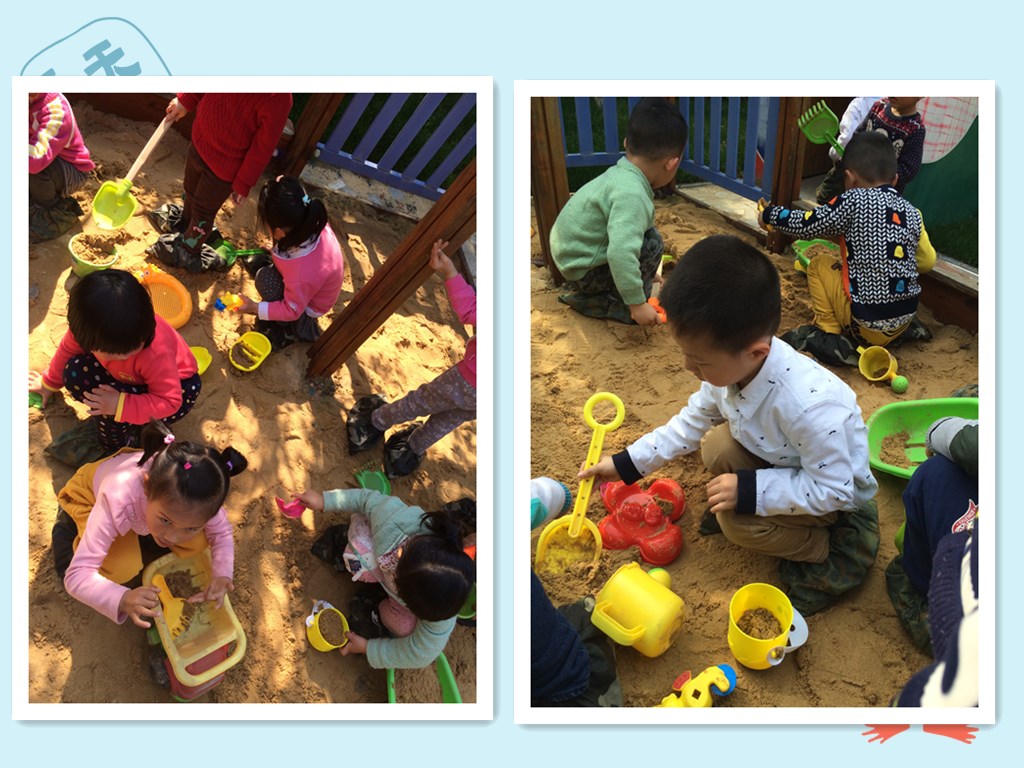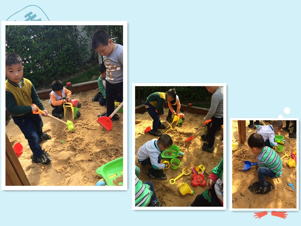 今天的天气真好呀,老师带我们出去玩我们一直期待的--沙池。沙池里有小铲子、运沙车、小桶等等,看到那么多玩沙的工具,我们真是太兴奋了!套好鞋套,我们就迫不及待地冲到了沙池里。小沙子摸起来软软的、热乎乎的,真好玩呀!