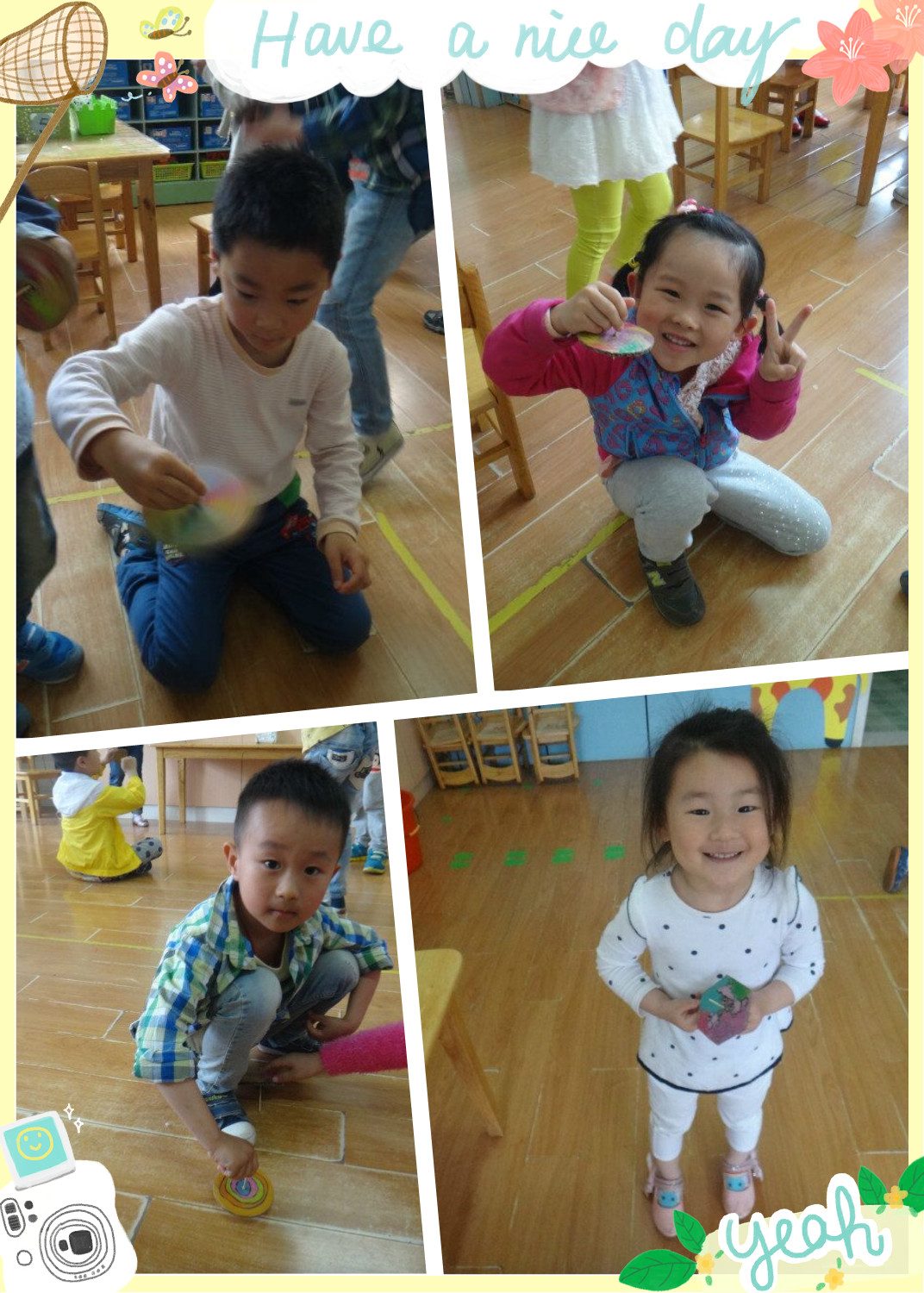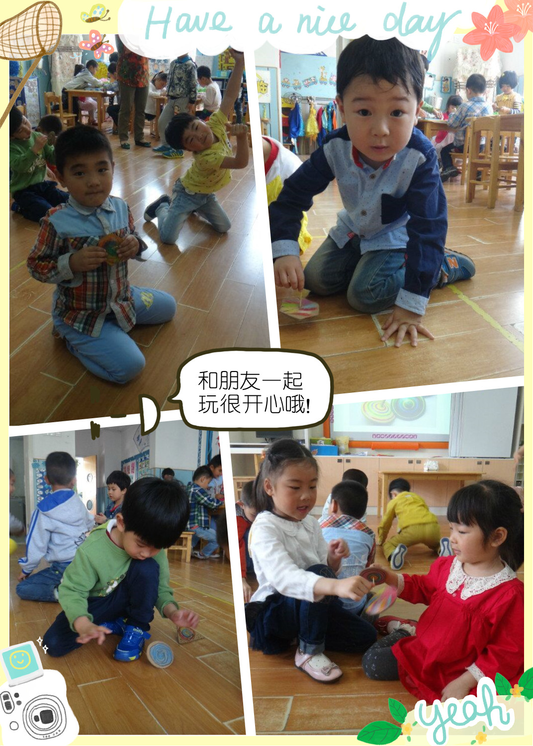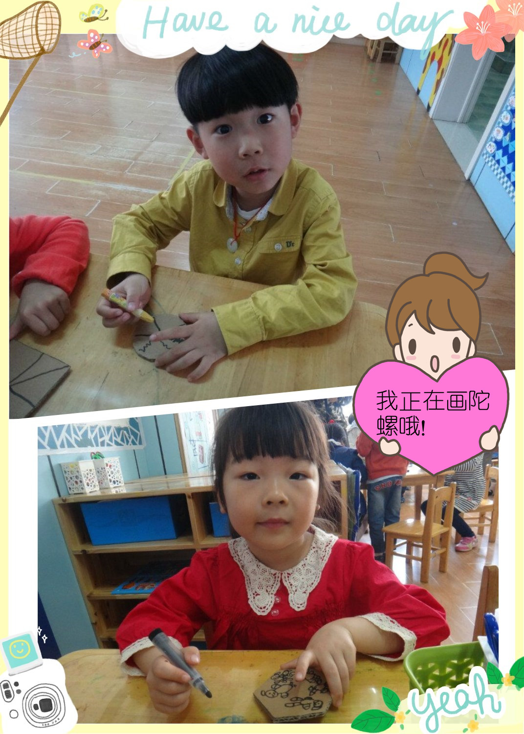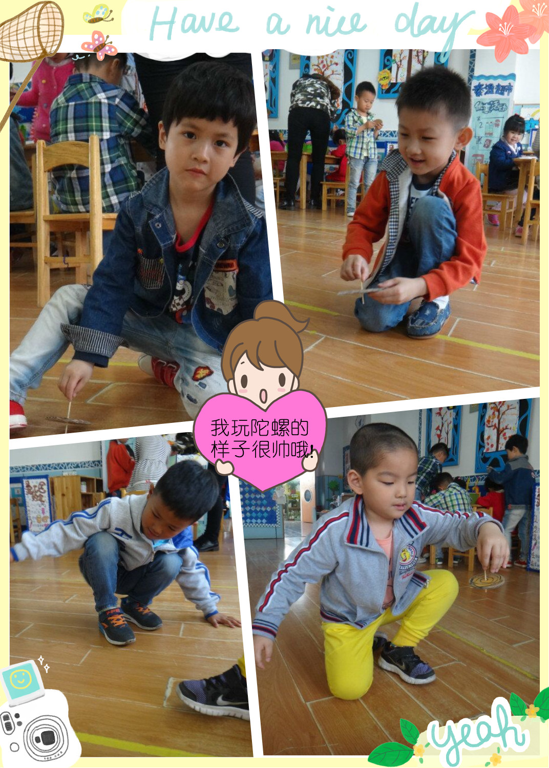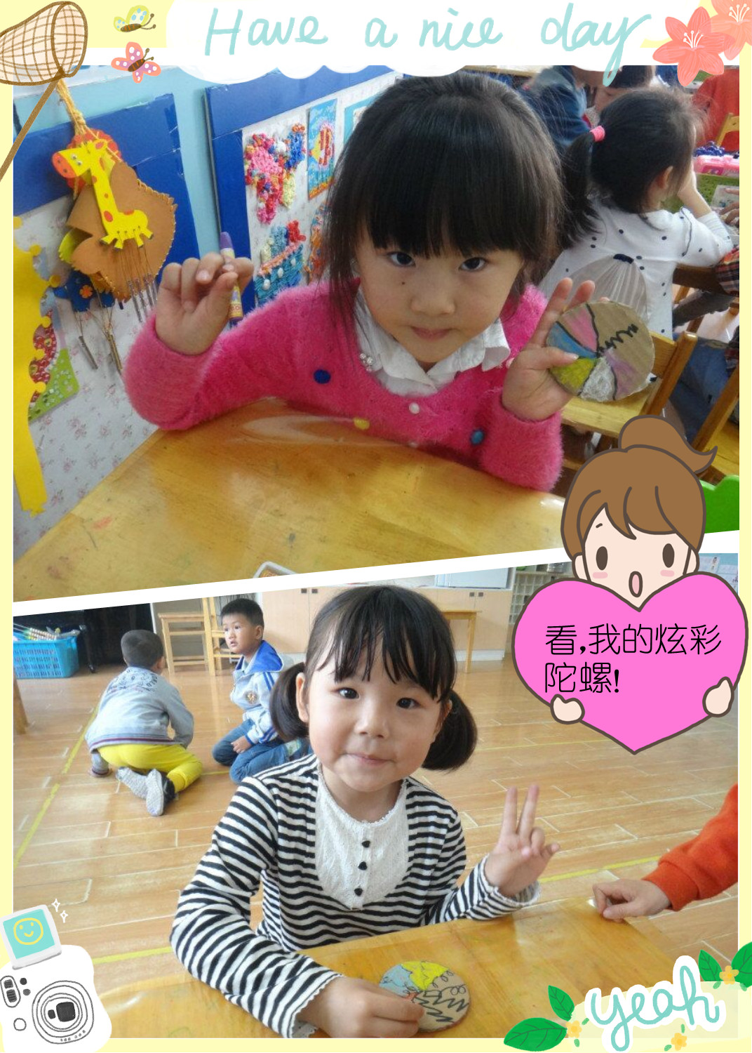 今天我们中六班组织了陀螺转转转的活动,一方面充实了幼儿的课间活动,另一方面教会了幼儿制作自己喜爱的陀螺,活动的内容很简单,1.幼儿用老师事先准备好的陀螺造型进行装饰 2.幼儿在老师的帮助下纸陀螺转动起来3.小组进行陀螺大赛。下面欣赏陀螺大赛的精彩照片吧!