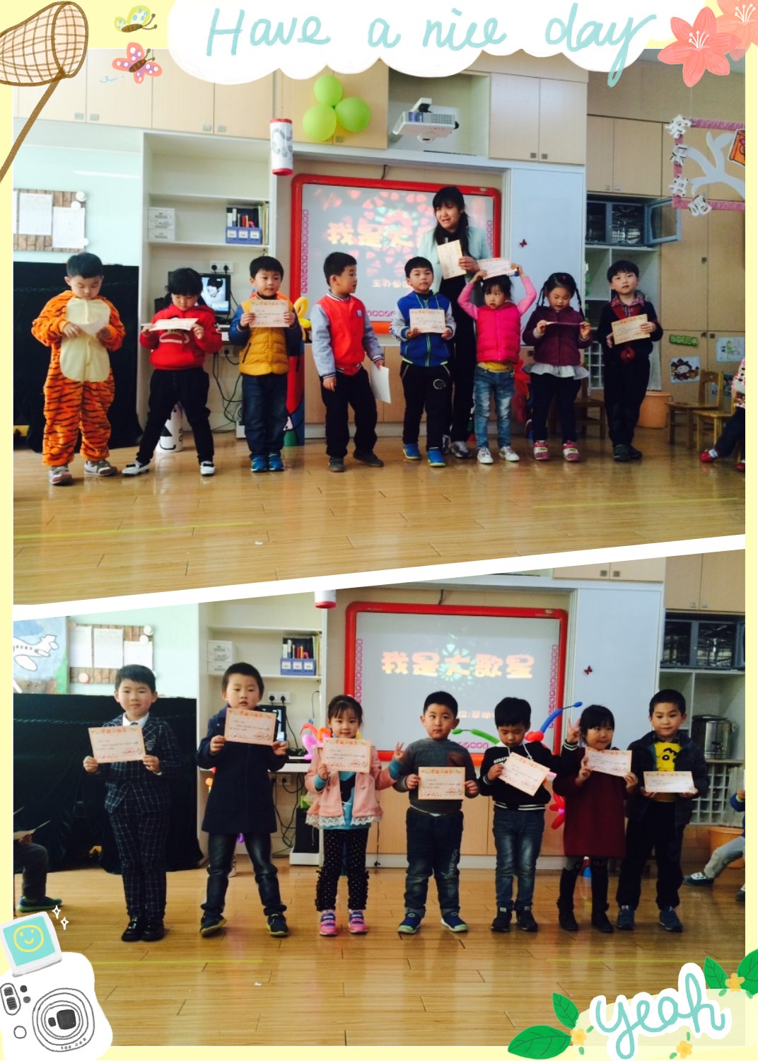 孩子们的精彩表现,获得大赛组委会的一致好评,由家委会主任亲自给孩子们颁发了奖状,祝贺这些获奖的大歌星们。