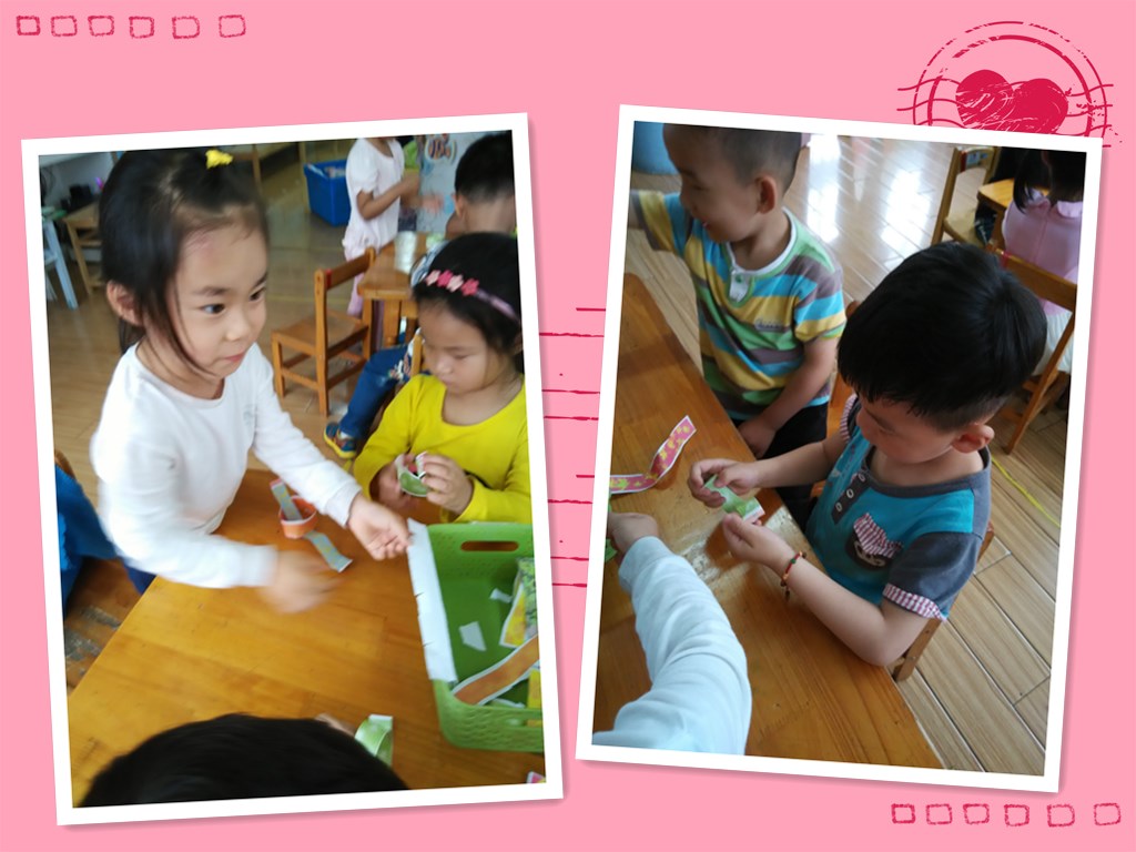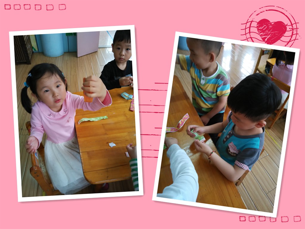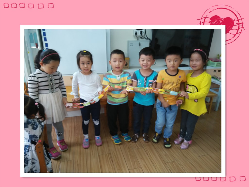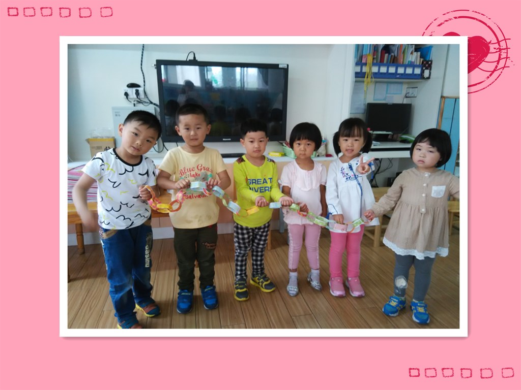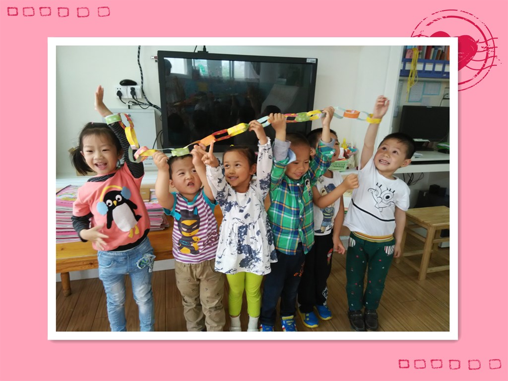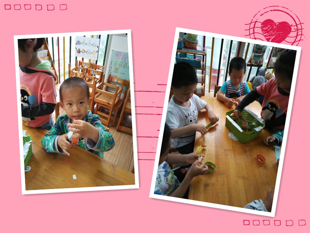 六一儿童节到了,我们也在忙活着呢。看!我们在用彩条做拉环,来装饰教室哦。五颜六色的小彩条真漂亮,就像小朋友们小手的拉着小手的样子,我们自己先做几个,然后在和别的小朋友合作做一个长长的拉环,快来看看我们哪组做得最长最好看吧!