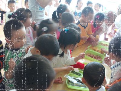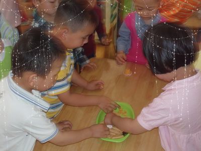 小五班的孩子来我们班给我们送来了好听的歌。 我们是小主人!用很多好吃的来招待他们。