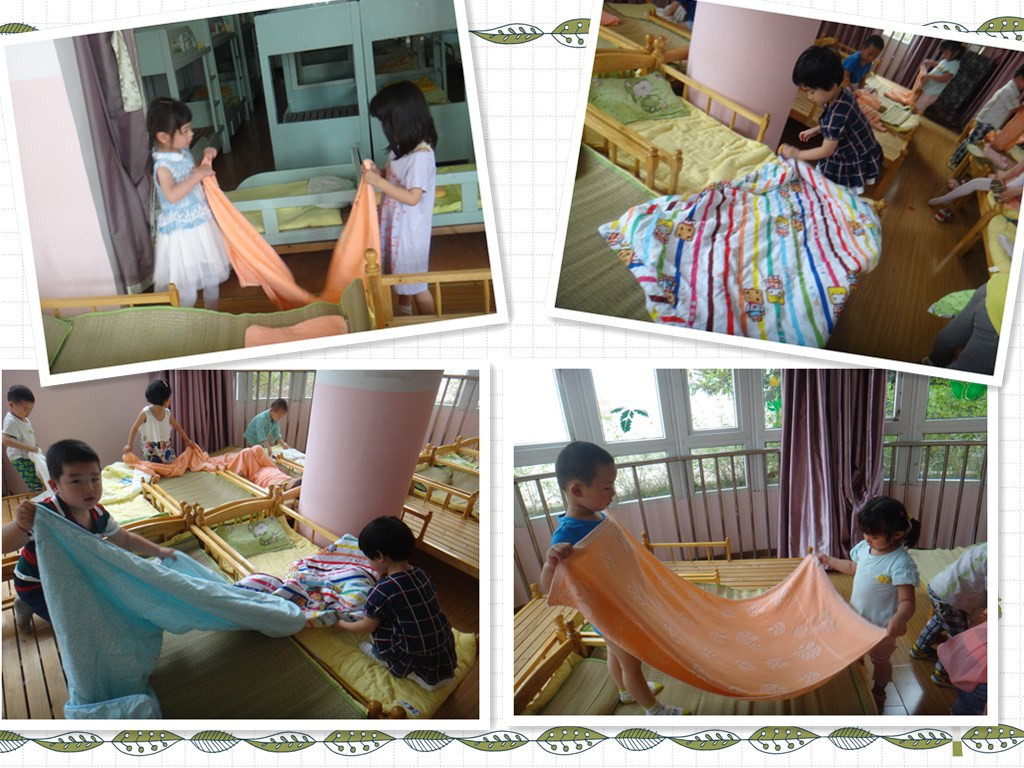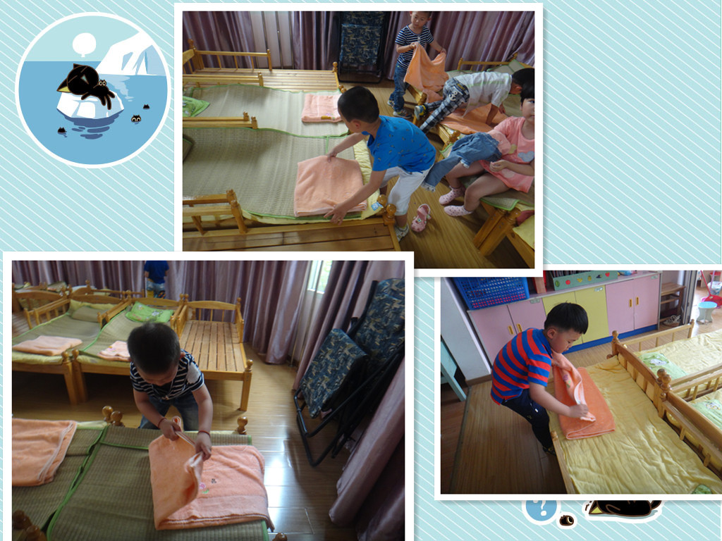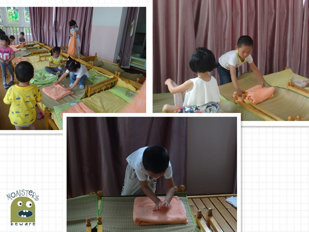 又是一年的夏天,我们长大了一岁,还记得刚来幼儿园的时候是去年的夏天呢,那时候的我们什么都不会做,就算连吃饭都想要老师喂,可是经过一年的幼儿园生活,我们长大了,现在的我们都会自己叠毯子了,爸爸妈妈,我们是不是很能干呢!