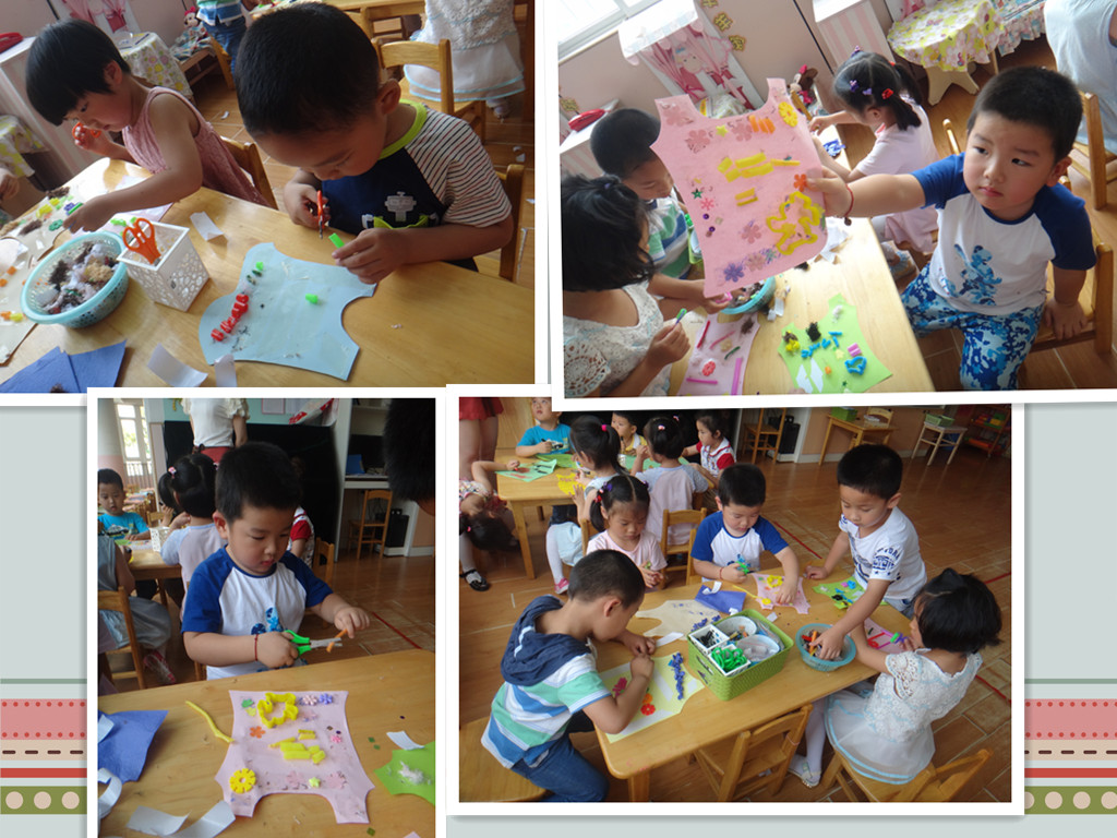 今天老师给我们准备了一些彩色的小背心,也给我们准备了许多材料让我们去装饰这些小背心,有彩线,吸管,毛根,彩纸,珠子等还有黑白、彩色勾线笔,好多好多材料,瞧!我们把这件小背心装饰的多漂亮呀!