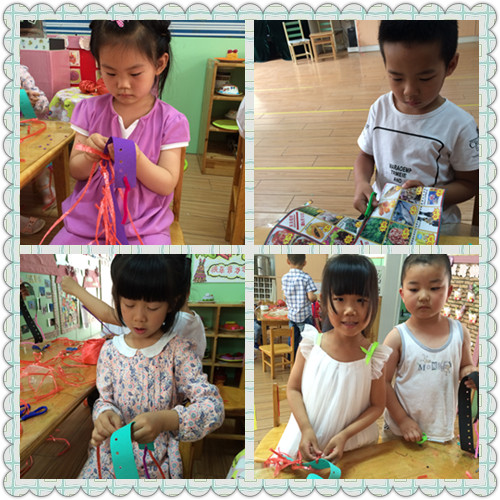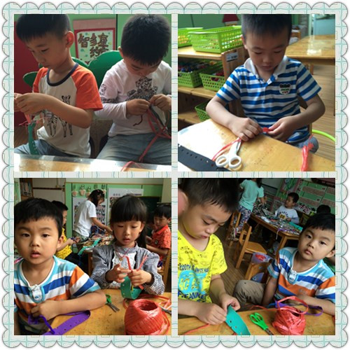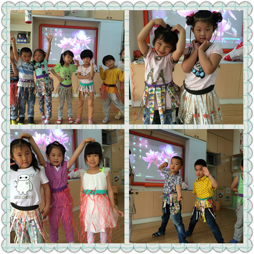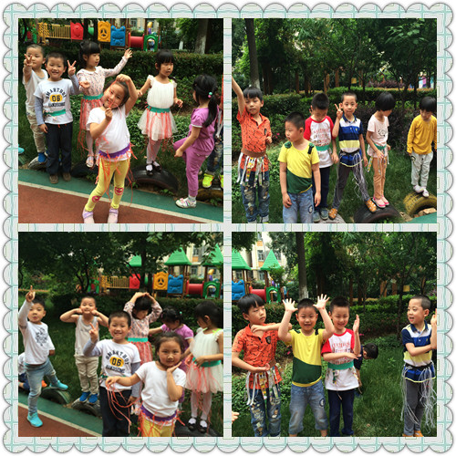 我们正在非常用心的制作草裙呢!告诉你哦!制作草裙的材料可丰富了,有废旧报纸、宣传单页、塑料包装绳等等。