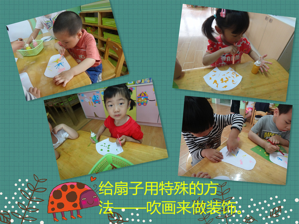 夏天最常用的工具——扇子,会给觉得好热的我们带来一阵阵凉爽的风,你会自己做扇子吗?今天老师教我们一起装饰了特别的扇子,用的是吹画的方法哟,真有趣。