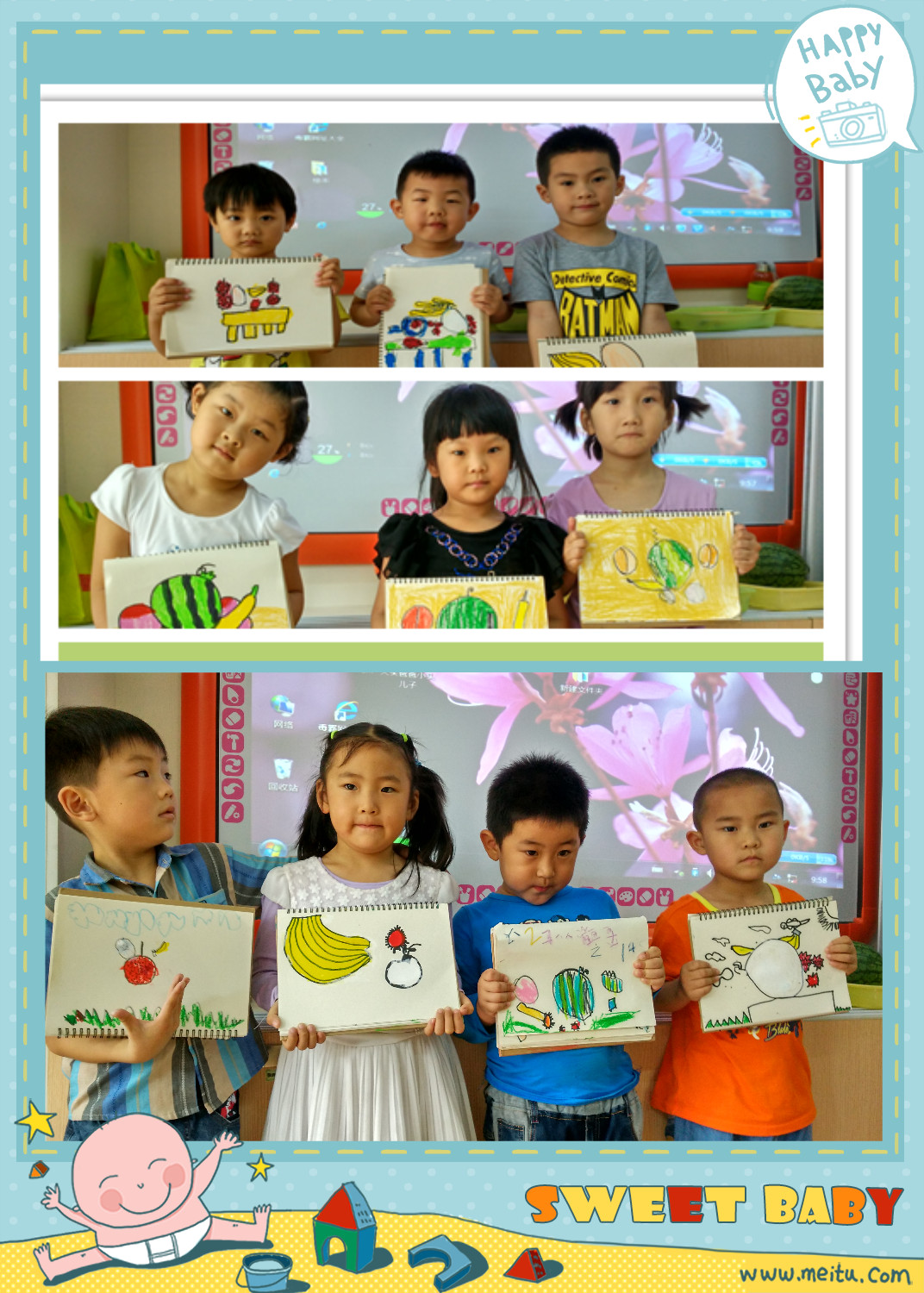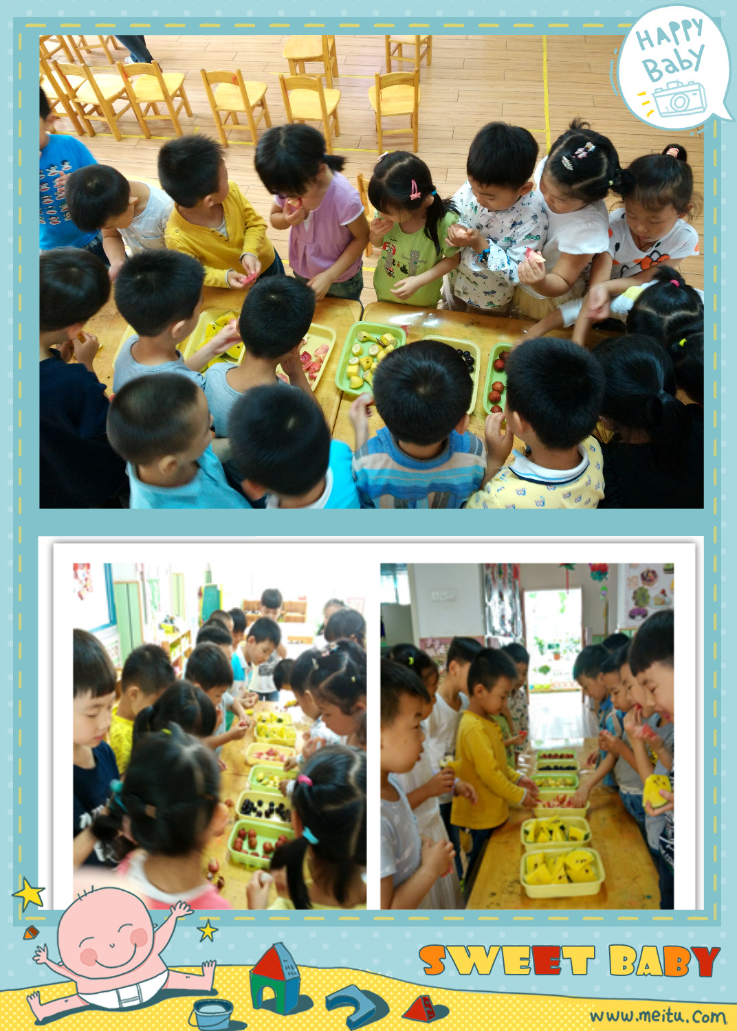 今天,老师带我们认识了夏天的水果。我们通过摸一摸、猜一猜、说一说,认识了多种夏天的水果;感知了各种水果的外形特征;了解了他们不同的营养价值。之后我们还进行了水果写生画;组织了水果品尝会。真是开心的一天。