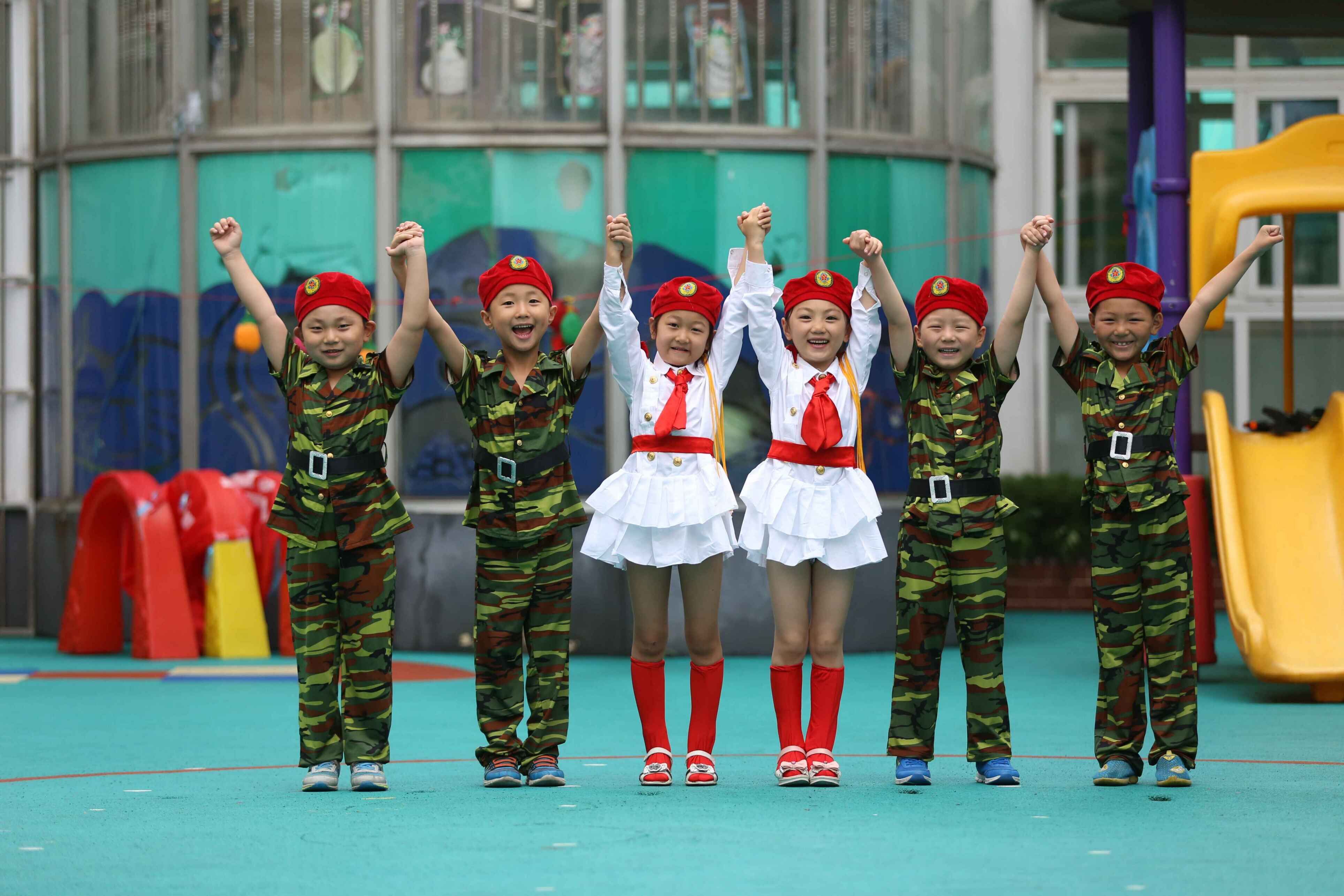 今天,我们好开心。因为,小吉爸爸来给我们拍照了。我们穿着很帅的军装,还穿了只属于我们大六班小朋友独一无二的衣服,和可爱的小伙伴摆着各种各样不同的姿势。我们站着、走着、奔跑着、趴着、奔跑着,笑声感染了整个幼儿园。