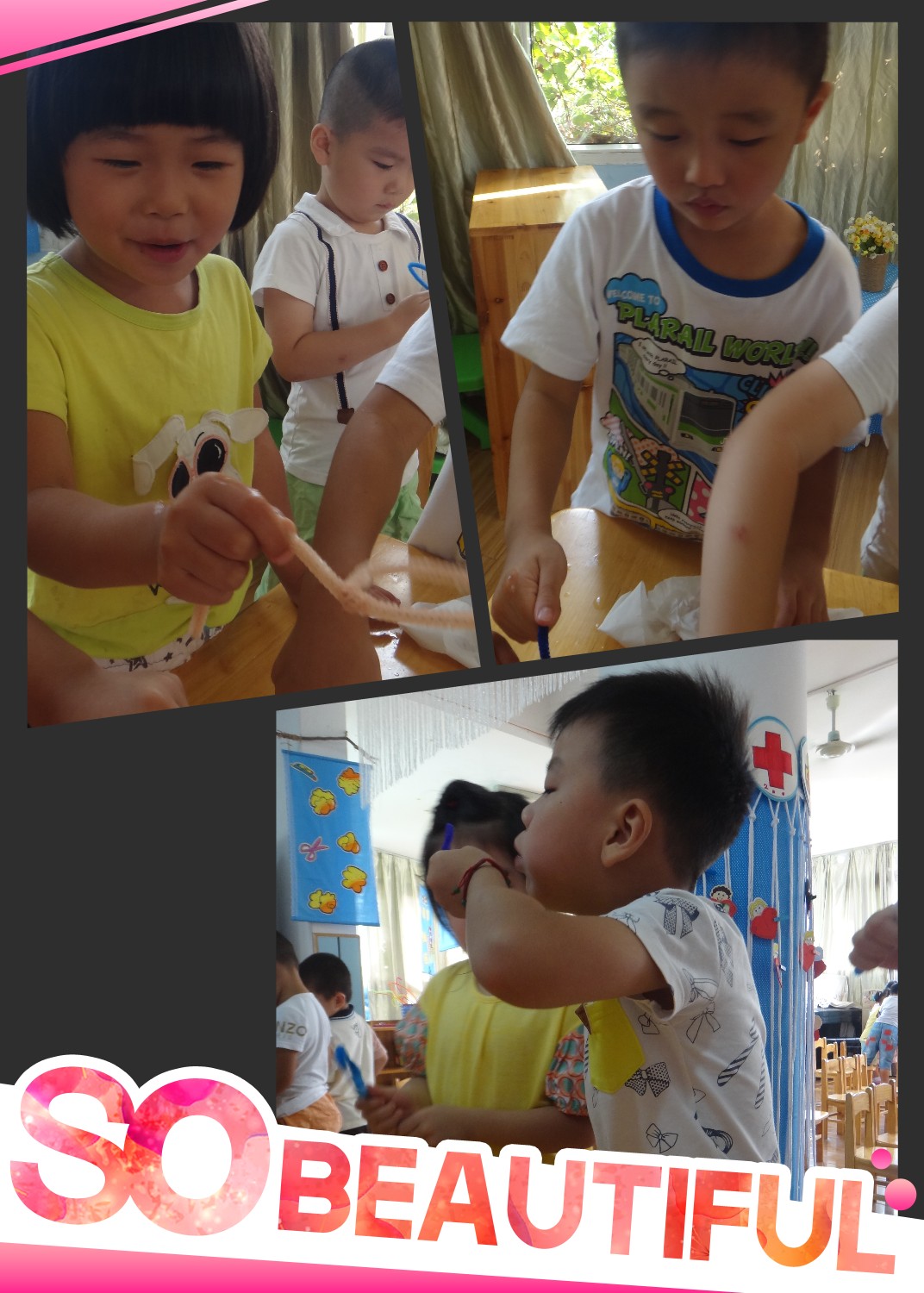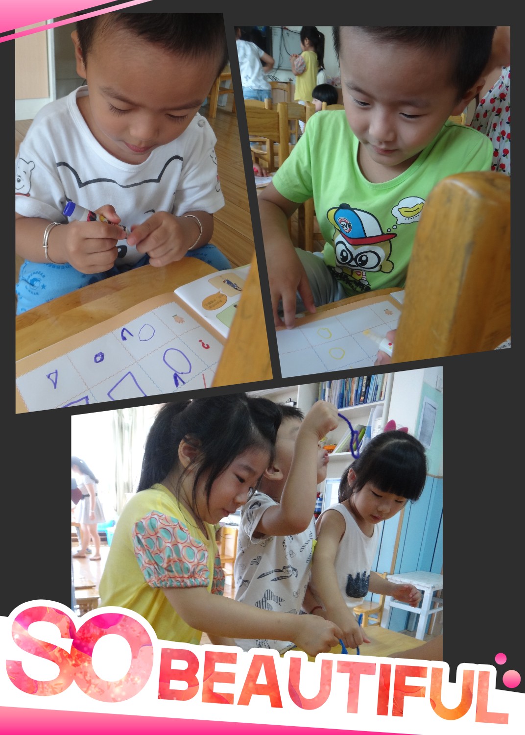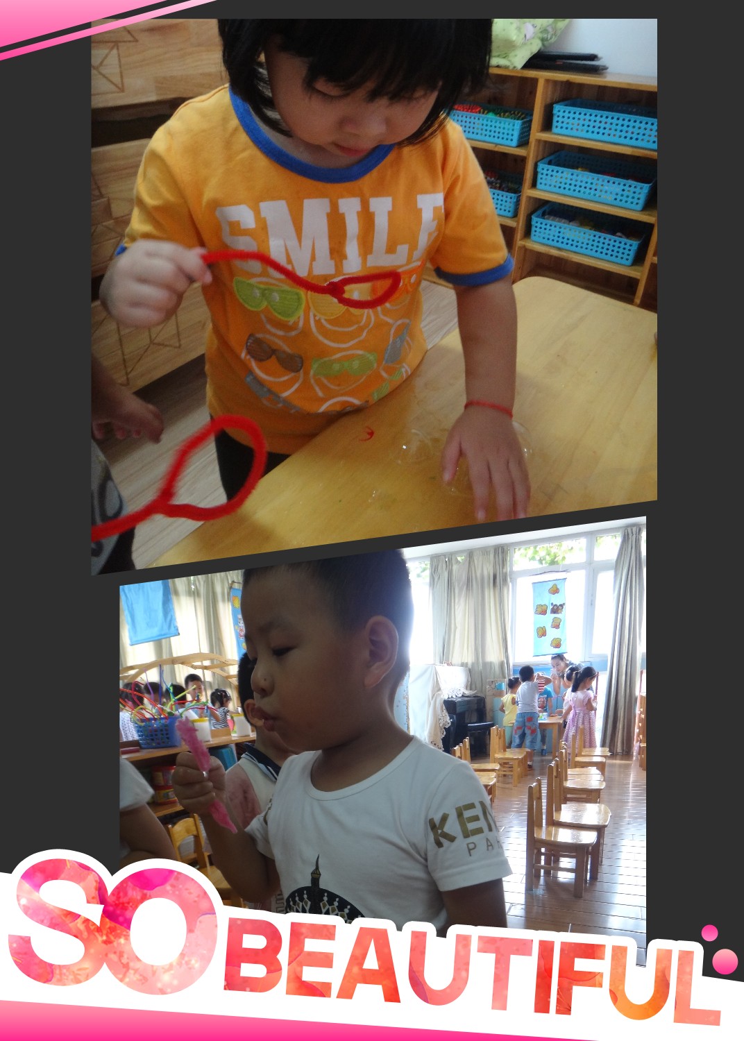 今天是九月八日礼拜三,我们上次制作的小工具派上用场咯~! 把泡泡器的大脑袋全部放进泡泡水里,吹泡泡咯! 拿着我们自己做得泡泡器吹泡泡,可真自豪呀! 圆形的泡泡器吹出的泡泡是圆形的,那正方形、三角形的泡泡器吹出来的泡泡是什么形状的呢? 我们先把自己猜的画在记录表上 再把看到的画出来! 吹泡泡吹泡泡,吹出一个个大泡泡,原来无论什么形状的泡泡器,吹出来的泡泡器都是圆圆的呀! |