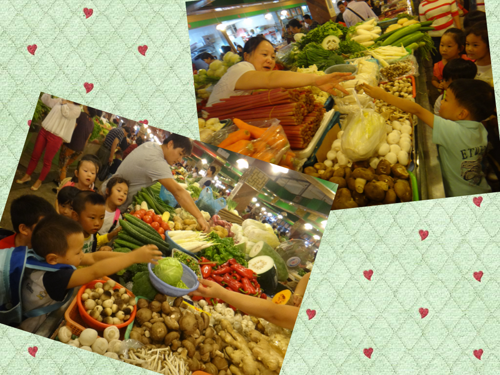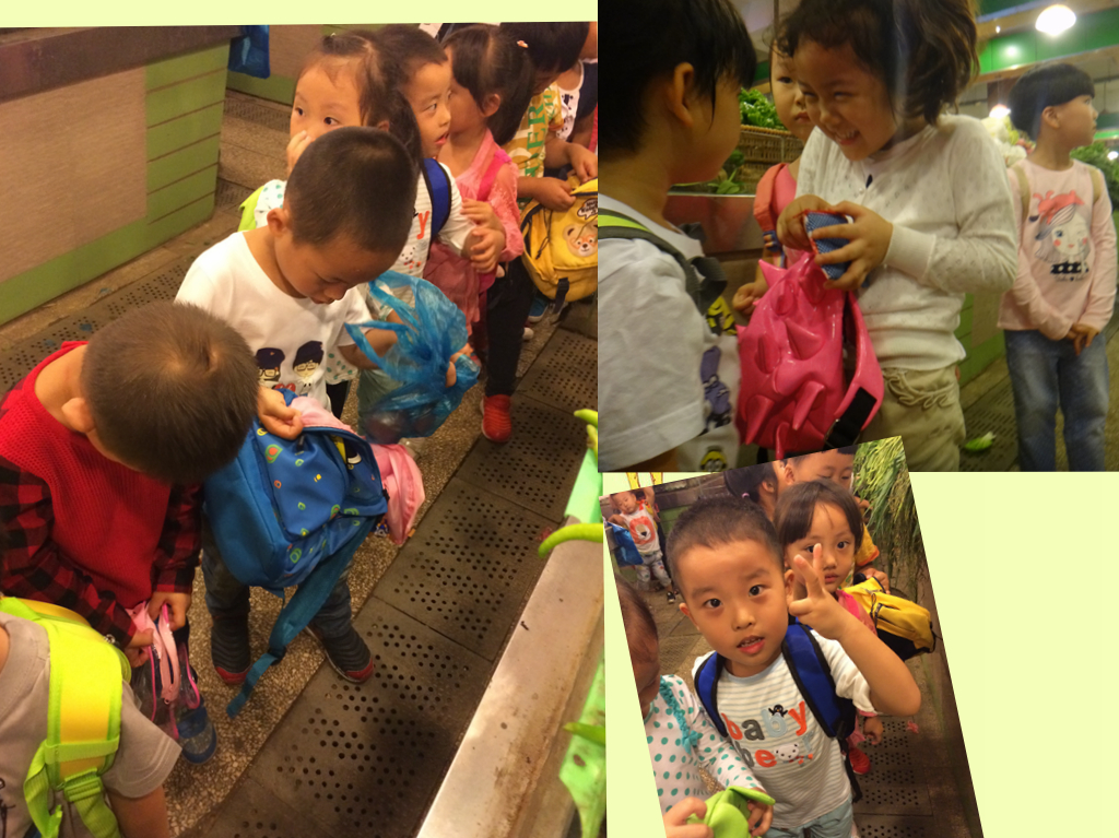 星期一的天气真正好,我们和老师去菜场买菜咯,我们每个小朋友带了一个背包和十块钱去菜场买菜,好开心呀。到了菜场门口,我们分成了三队分别跟着三个老师,买菜的时候老师让我们自己跟老板说说要买什么菜,多少钱,第一次体会到买菜的乐趣,真的好开心!