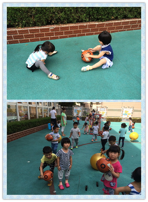 和好伙伴一起玩皮球,我们还会投篮呢!