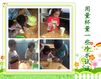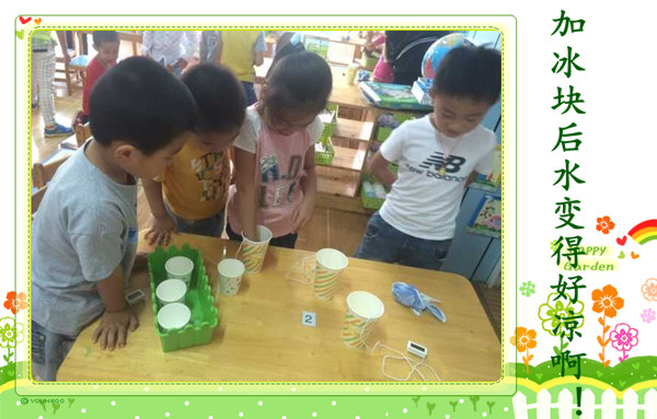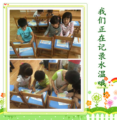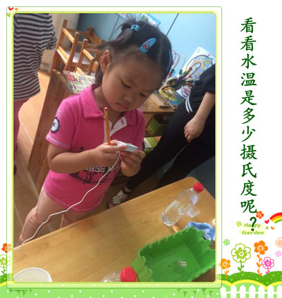 今天大六班的孩子们做了一个有趣的科学实验——热水怎样变冷。 首先孩子们通过感知,包括用眼睛去观察热水和用手去轻轻触摸热水,初步了解实验对象(热水)。 其次教师对孩子们提出问题‘你觉得可以使用哪些方法使热水变冷?’。孩子们想出了很多方法:包括可以使用空调给热水降温;吹电风扇给热水降温;加小冰块降温;加冷水降温等方法。 最后孩子们使用了方便读数的电子温度计进行了两个好朋友合作实验。实验分为三次,第一次是幼儿通过加冰块的方法使热水变冷;第二次是幼儿使用给热水扇风的方法;第三次是幼儿通过加冷水的方法使热水变冷。 孩子们在操作过程中都非常的开心,下面让我们一起走进他们的实验吧! |