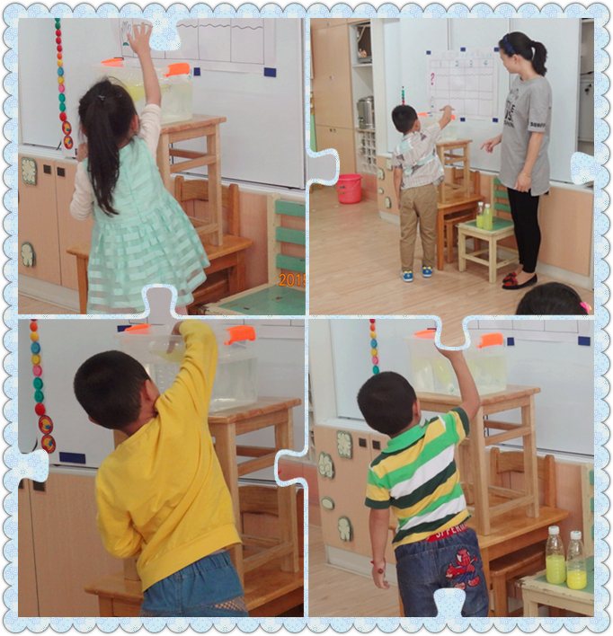 原来是小瓶子们在水里沉沉浮浮的小实验~好简单!小朋友们也开始摩拳擦掌,他们也要试一试!