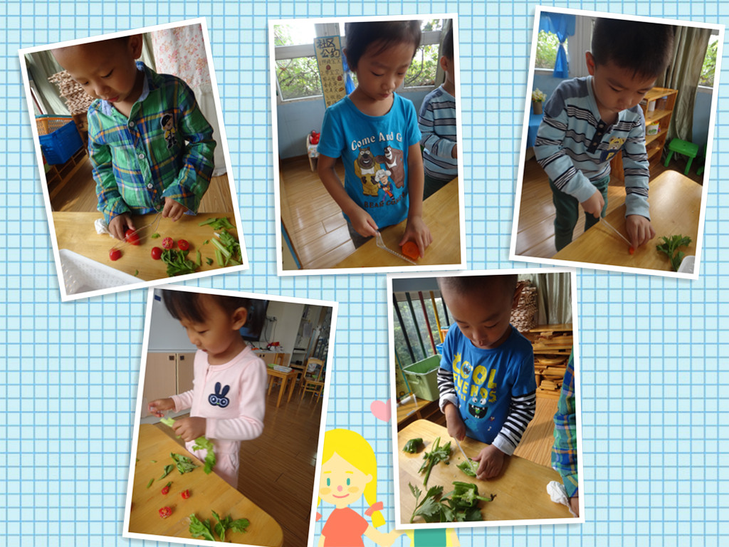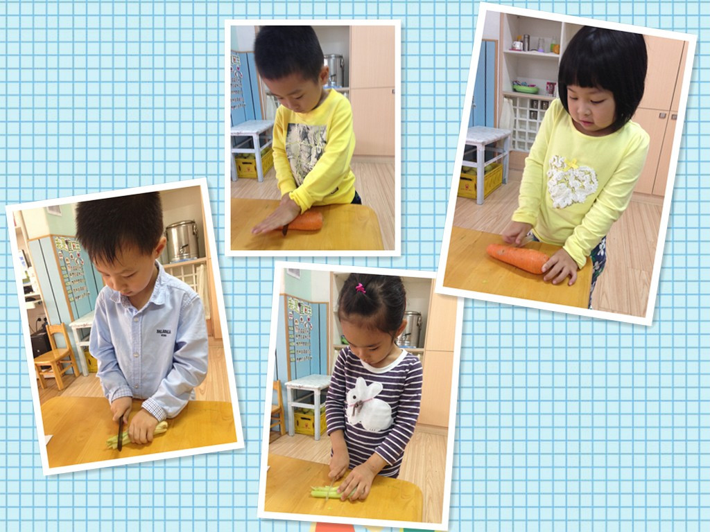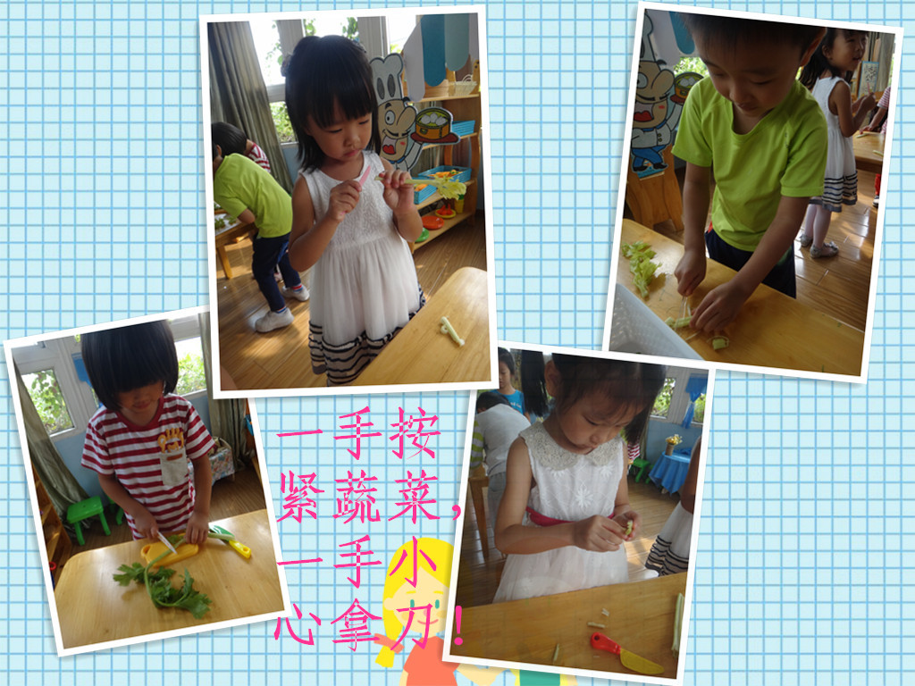 让我们一起来看一看!一只小手按紧蔬菜,另一只小手拿着刀切!