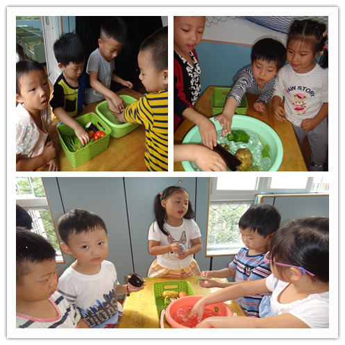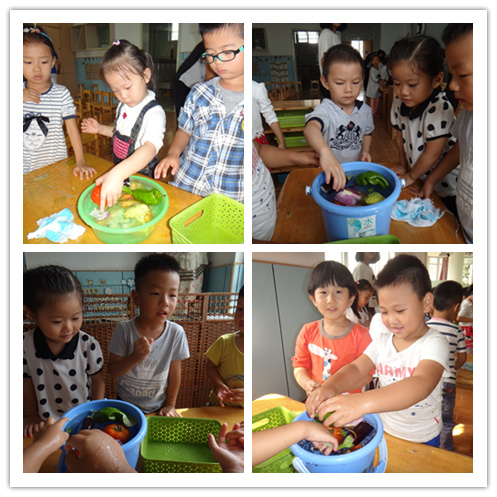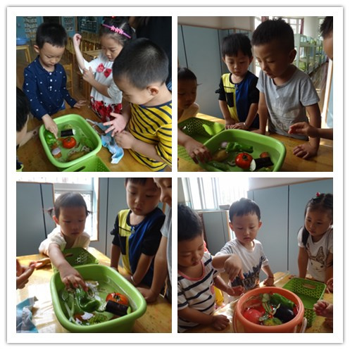 我们发现土豆、胡萝卜会沉下去,青菜叶子、茄子、青椒、茄子会浮在水面上哦,这些蔬菜就是安全过河啦。