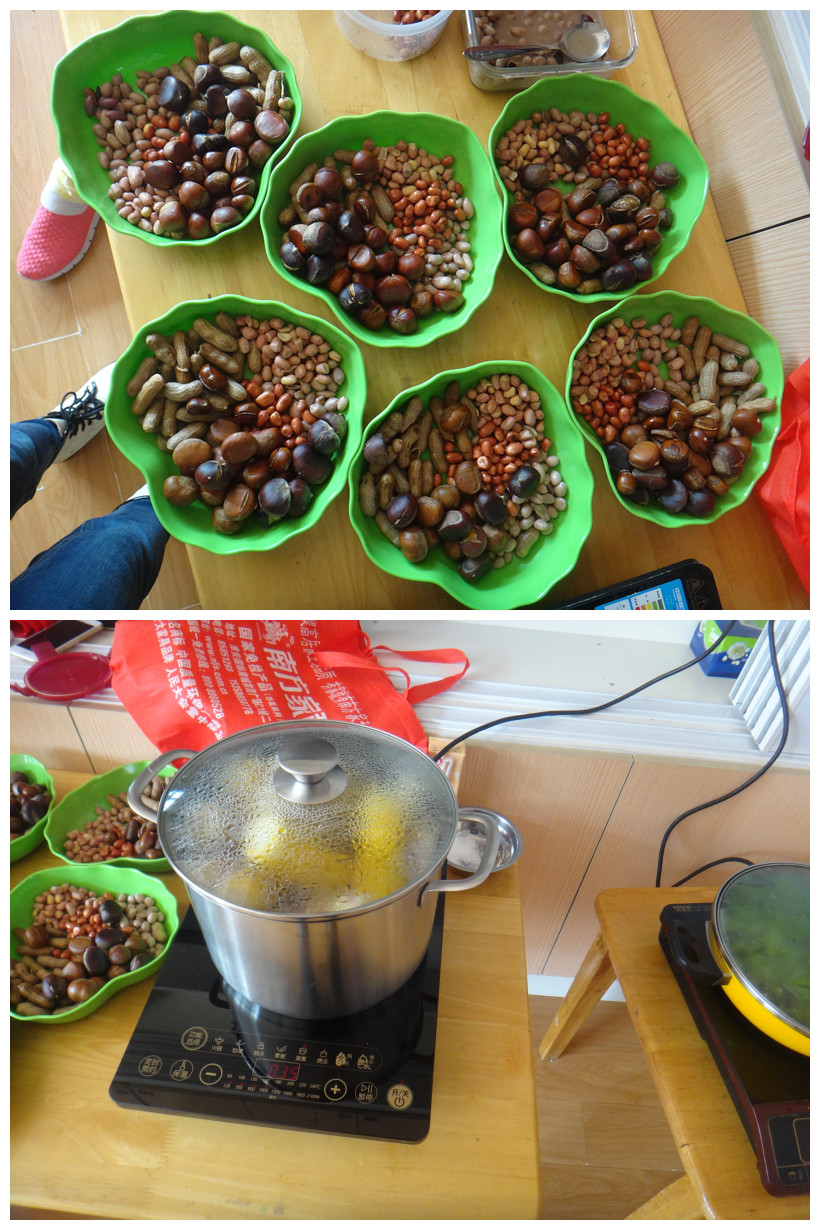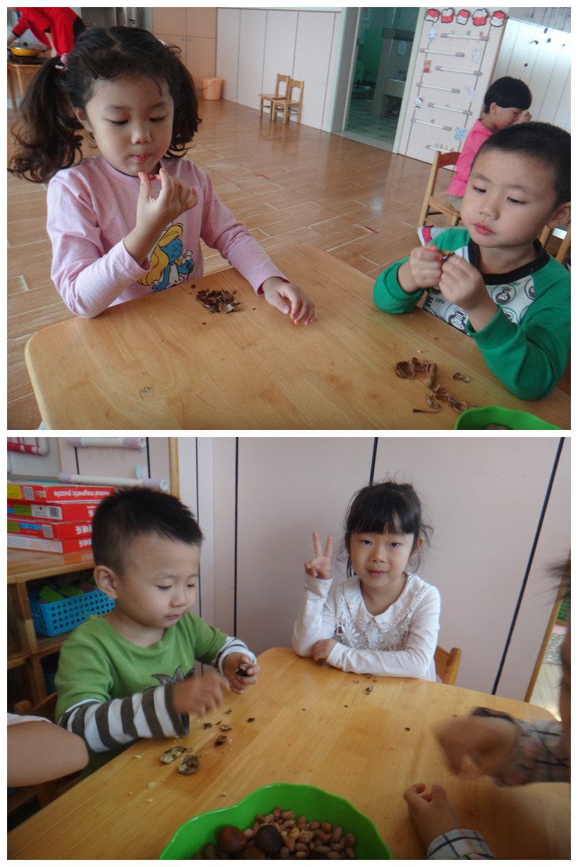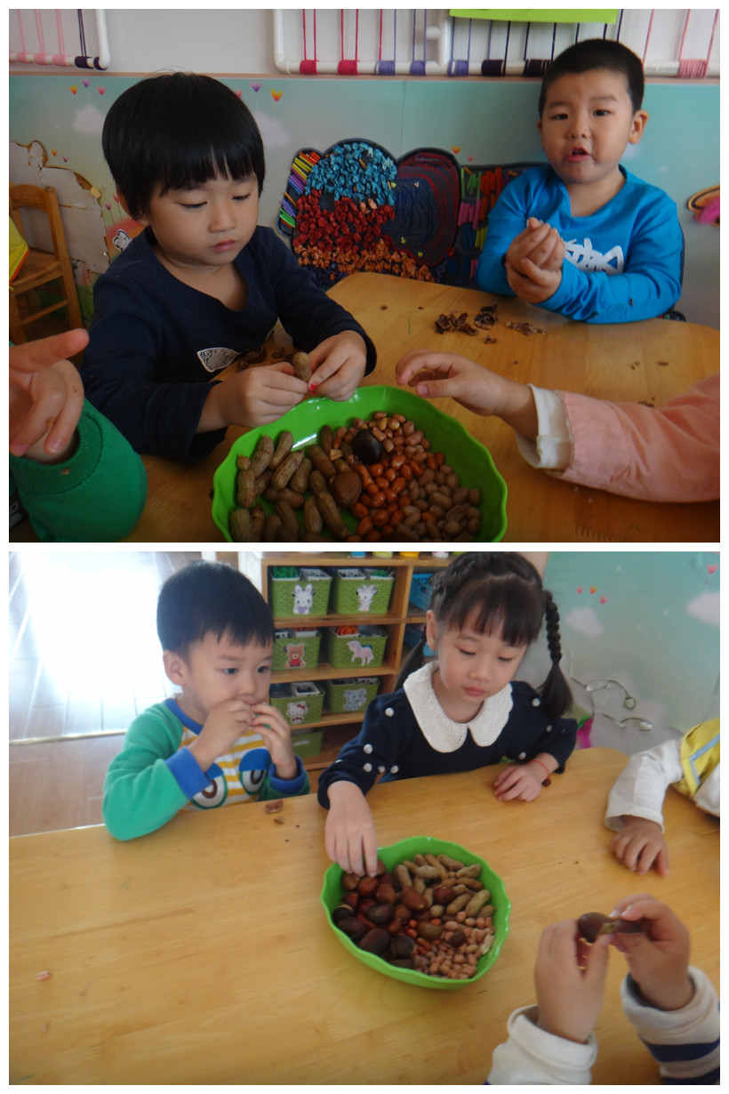 我们今天品尝了花生、板栗、玉米、毛豆,这些都是农作物。花生米是有很多味道的,有奶油味道的、也有用盐炒的味道咸咸的、还有带壳的是水煮的哦,另外,我们吃的毛豆和家里的不一样,是用水煮的还加了一些生姜、盐、八角,让味道变得更好,最后我们还品尝了玉米。老师说下午还带我们品尝一些山芋和芋头哦!