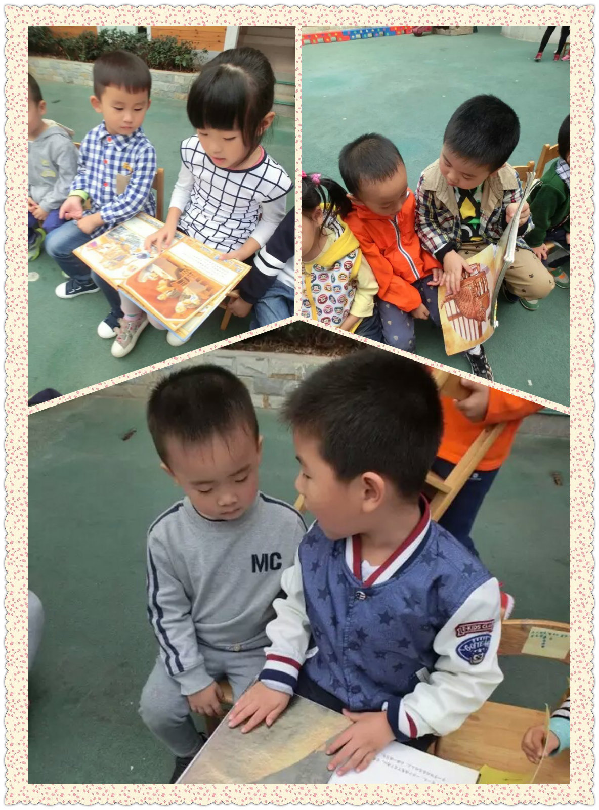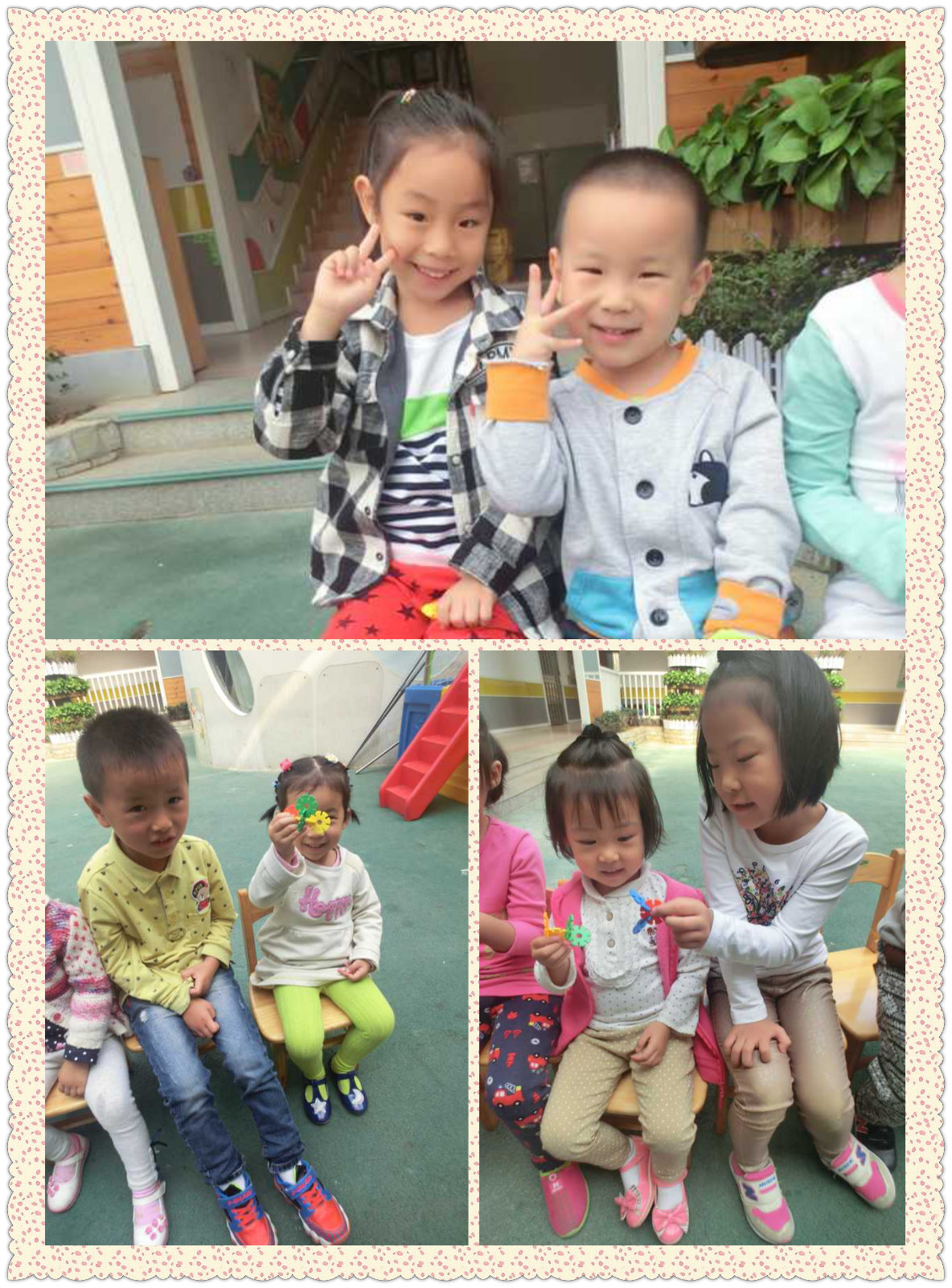 最近我们在幼儿园认识了特别的朋友——大一班的大哥哥姐姐们。中午我们会快快吃完饭等待他们的到来,他们会坐在我们旁边陪我们玩积木、给我们讲故事,最重要的是,他们会告诉我们哪些事情可以做,哪些事情是不可以做的。比如:不能在楼梯上跳来跳去、收玩具的时候怎样拆雪花片、爬小山坡的时候要看好路不能跳来跳去,睡觉之前要先去上厕所等等。