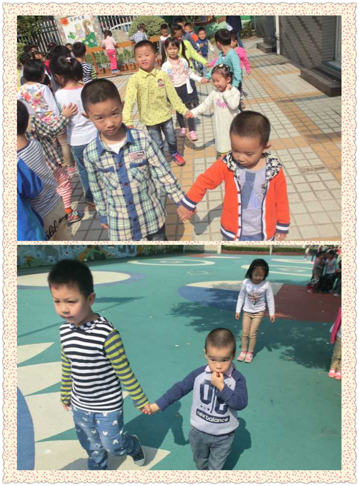 我们手拉手一起去散步、爬小山坡、过小桥,散步的时候他们会牵着我的手不放开,爬小山坡的时候他们会小心翼翼地帮我看好路,过障碍桥的时候他们会在一旁保护我们。。。