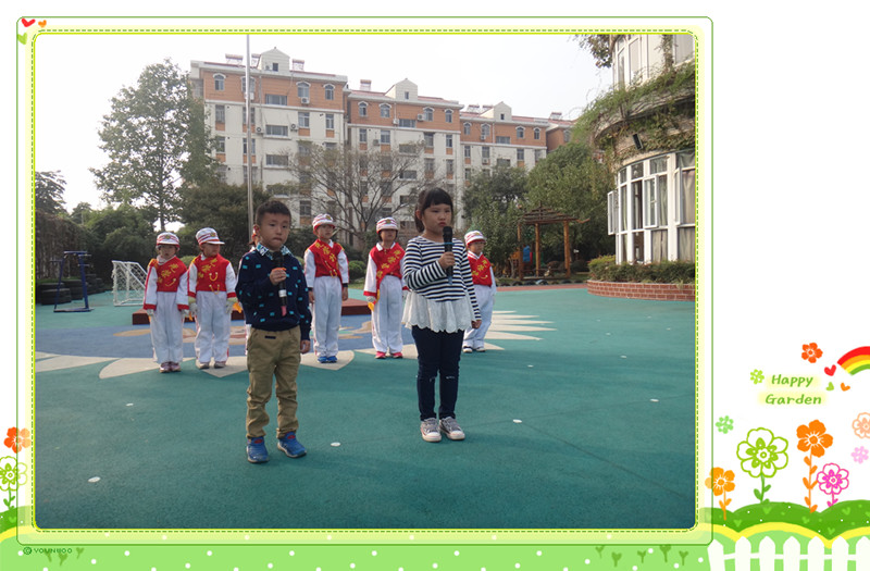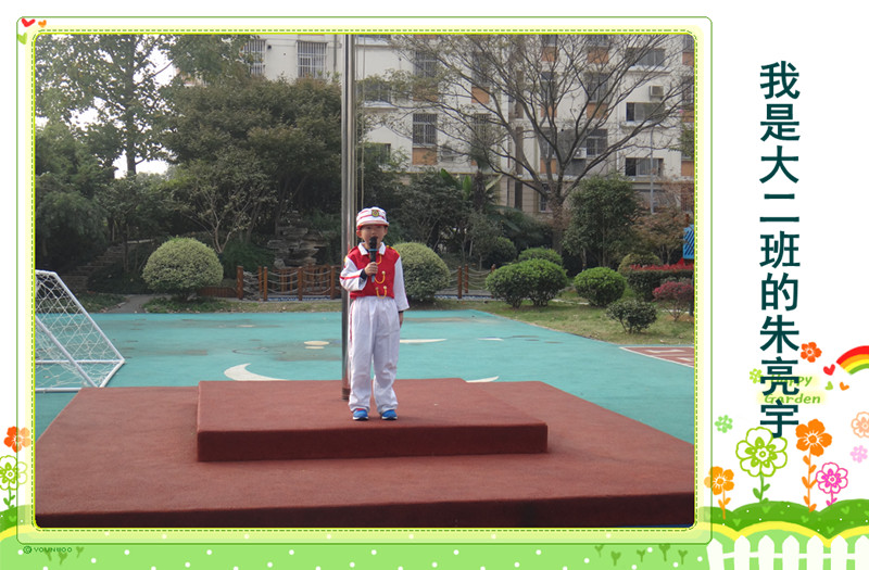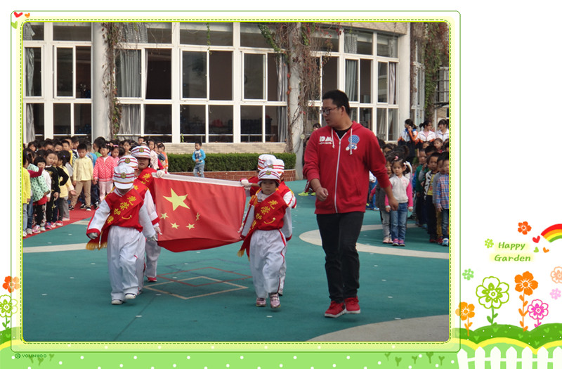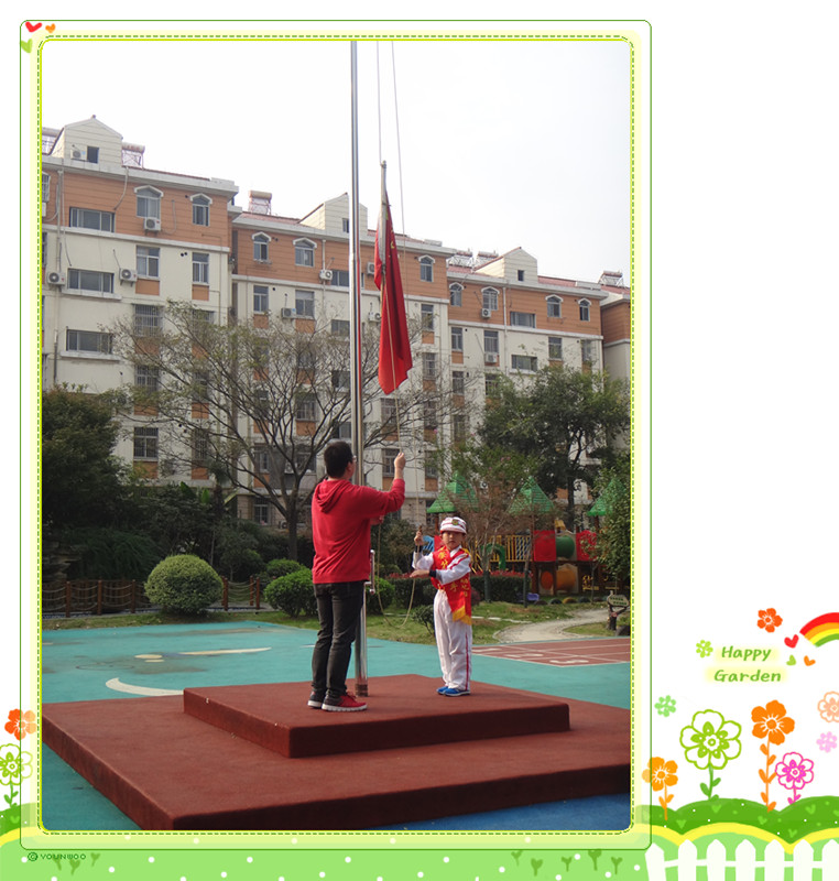 2015年10月26日上午,南京市翠屏山幼儿园举行了第九周升旗仪式。金色的阳光洒满大地。在这静谧而清新的早晨,南京市翠屏山幼儿园的小朋友和老师们排着整齐的队伍,有序站立在操场上等待着升旗仪式的举行。 8:30分升旗仪式正式开始。担任本周升旗手的是来自大二班的朱亮宇小朋友。他是一个能和同伴友好相处,自己的事情自己做,积极回答问题的小朋友。 本周的护旗手们分别是朱自然、陆曼、邵熠轩、史宇芯、陈梓文以及曾维思小朋友。全场的小朋友们、家长、老师们伴随着乐曲唱起国歌,歌声嘹亮,悦耳动听。 |