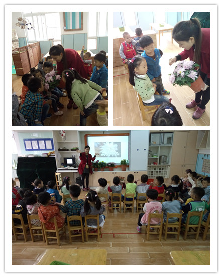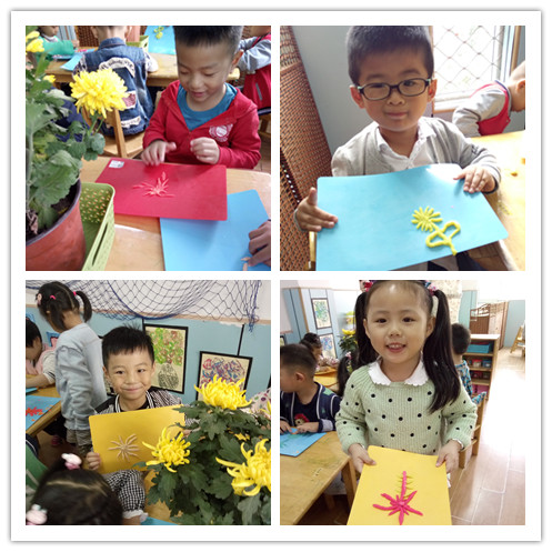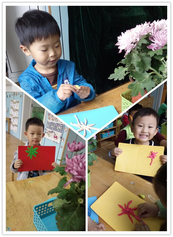 秋天到了,美丽的菊花开放了,我们把菊花请到了班级里,和小朋友一起观赏,那我们来一起看看有哪些菊花吧! 菊花有好多漂亮的颜色啊,有黄色、淡紫色的、红色等等,欣赏完了菊花,我们来自己动手做一做,你们看,我做的是不是很像啊! |