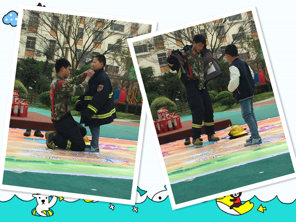消防员叔叔为我穿上了厚厚的战斗服。