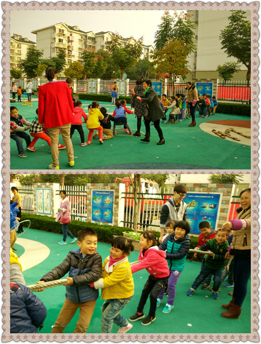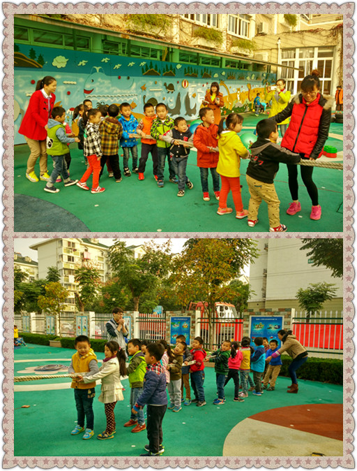 今天,我们不仅要运动、要锻炼;我们还要和大一班的小朋友们进行一场激烈的拔河比赛。大二、加油!大二,雄起!