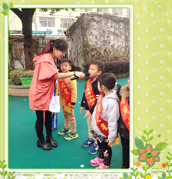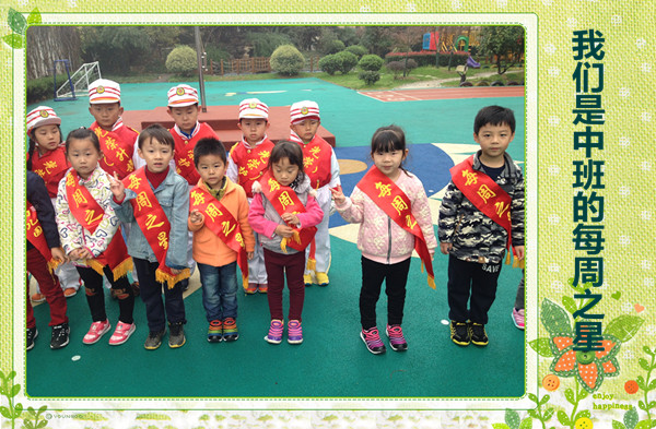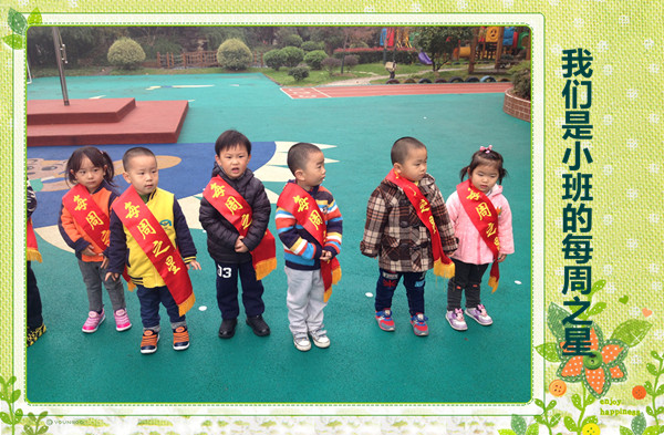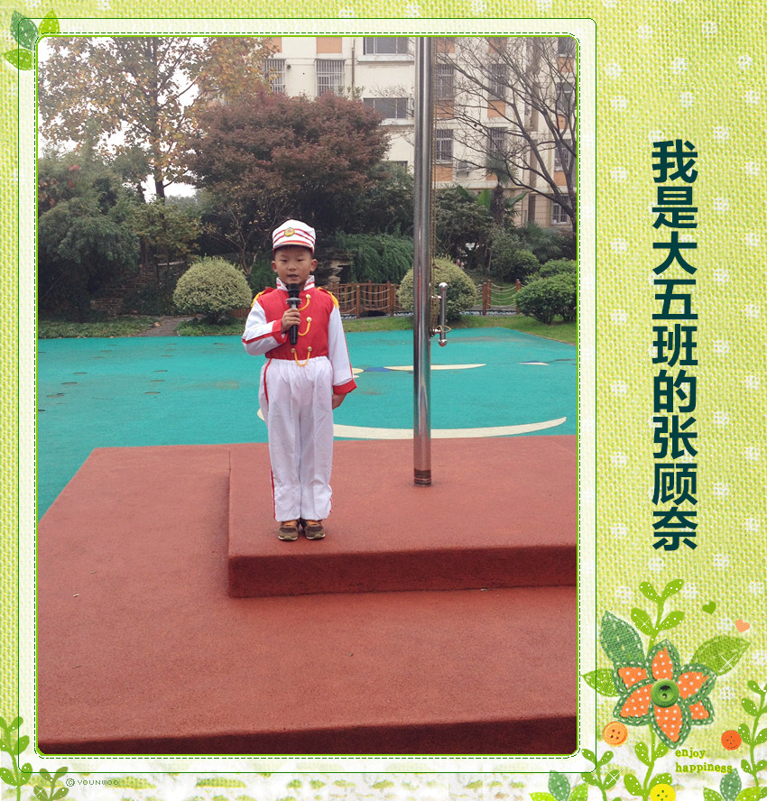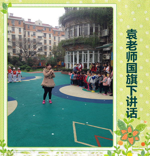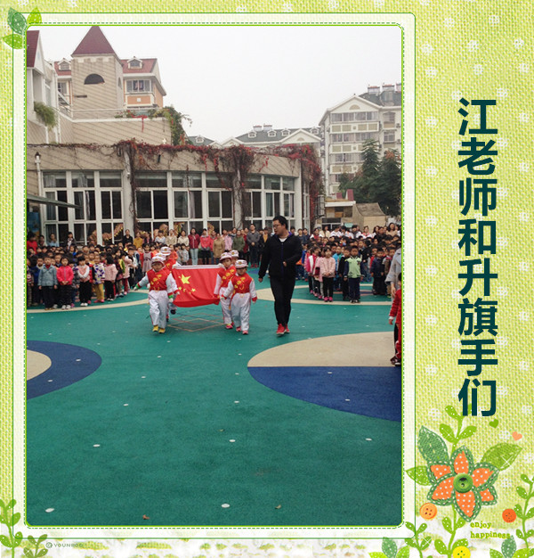 2015年11月16日上午,南京市翠屏山幼儿园举行了第十二周升旗仪式。8:30分升旗仪式正式开始。担任本周升旗手的是来自大五班的张顾奈小朋友。他是一个礼貌懂事、谦让有礼,热爱劳动的小朋友。 本周的护旗手们分别是大一班的李锦燃、大二班的何钰、大三班的汪梓伦、大四班的周心玥、大五班的张睿博和大六班的李怡然。瞧,他们在江老师的带领下走的多整齐啊! 庄严的国歌声,回响在我们幼儿园的上空。一张张稚嫩又肃穆的脸庞,流露出对祖国妈妈无尽的爱意。一周美好的生活,从现在的甜蜜时刻悄然而至! 今天国旗下讲话的是中五班的袁老师,小朋友们都要做能干的宝宝哦! 接下来是大班的每周之星。 然后是中班的每周之星。