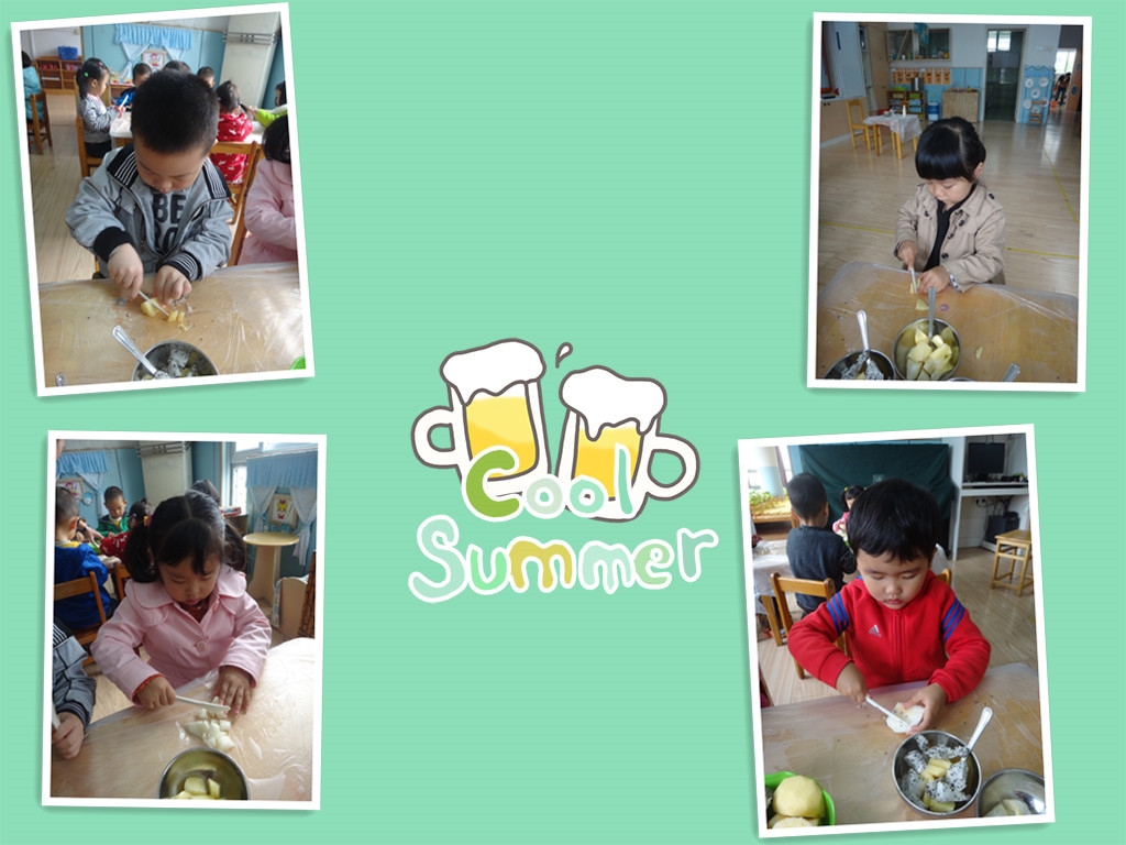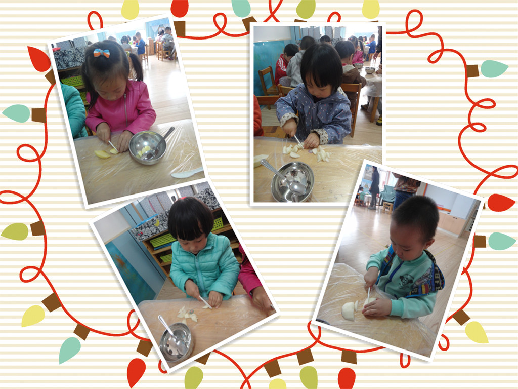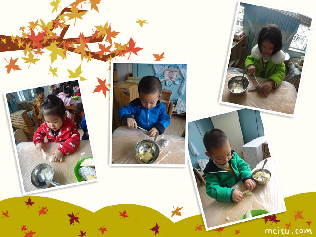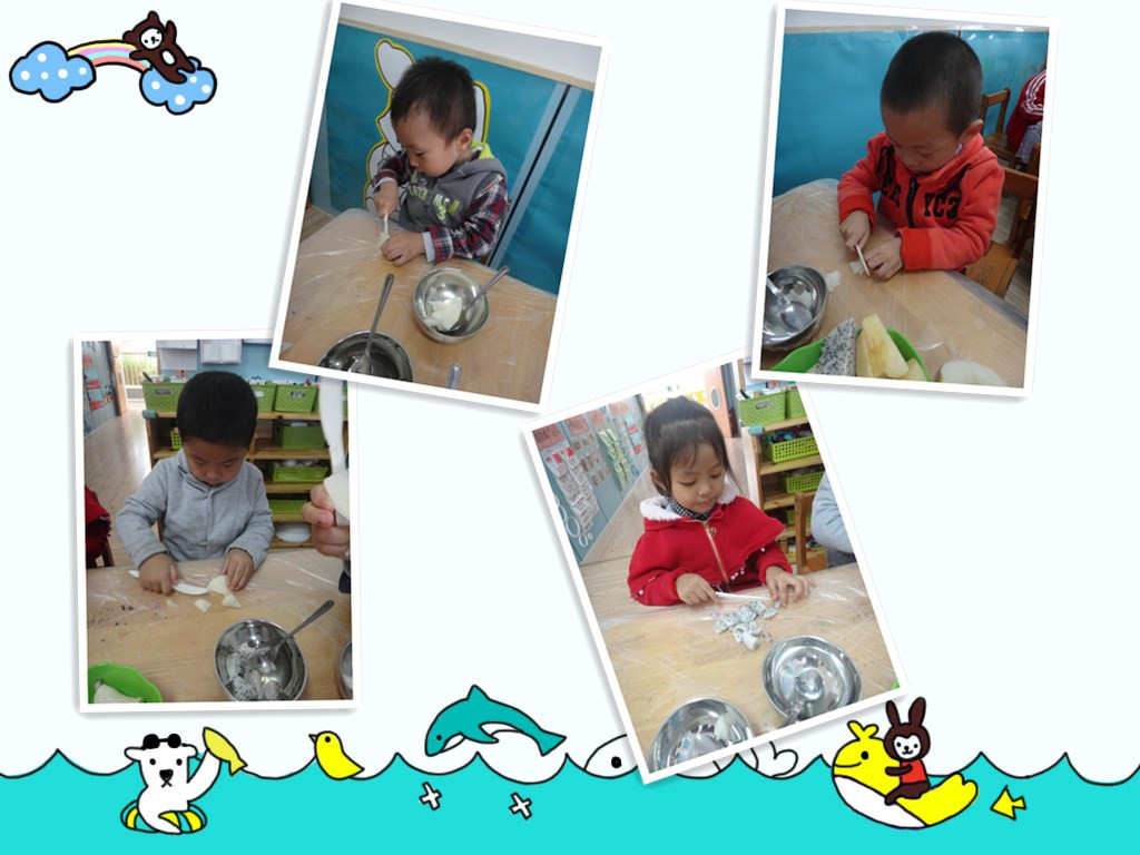爸爸妈妈快来看,小朋友们都自己做水果沙拉啦!老师先把所有的水果洗好,分好!准备工作做好后,小朋友开始操作了,先用刀把香蕉切成小薄片,再把苹果梨子还有火龙果切成小四方块,(用刀的时候一定要小心呦!)然后把它们一起放在盘子里,最后放上沙拉酱用勺子搅拌均匀即可食用啦!