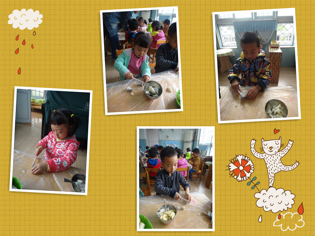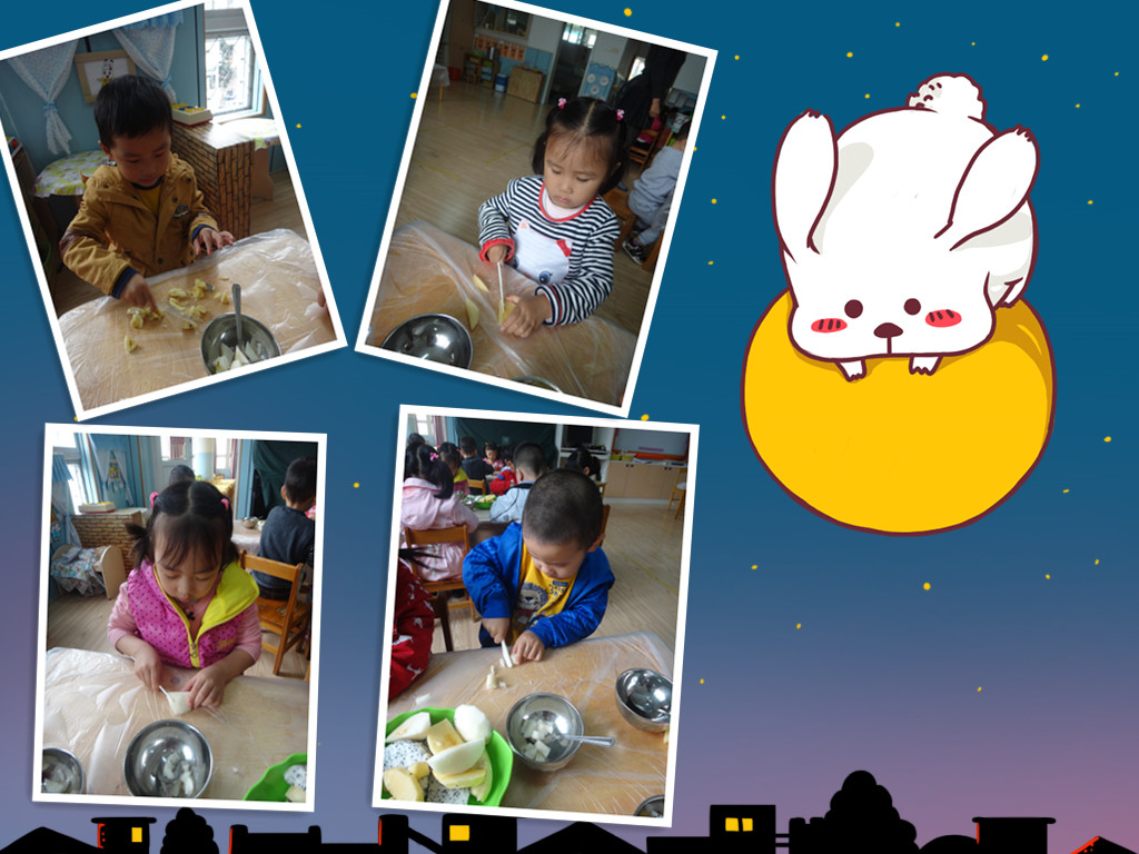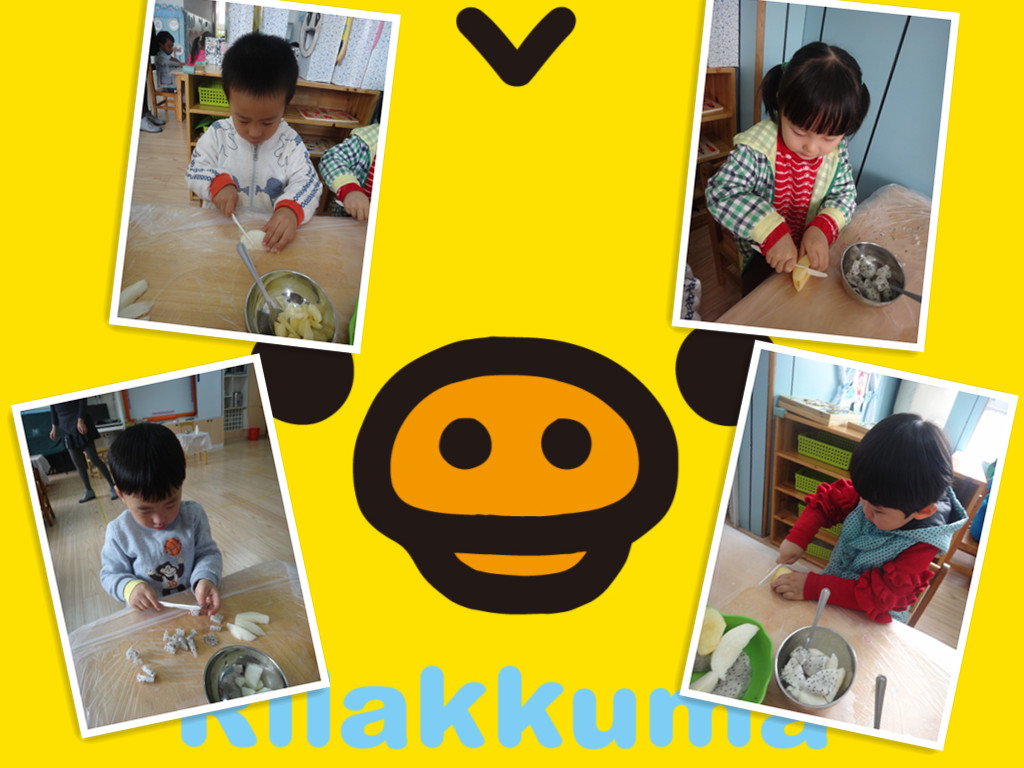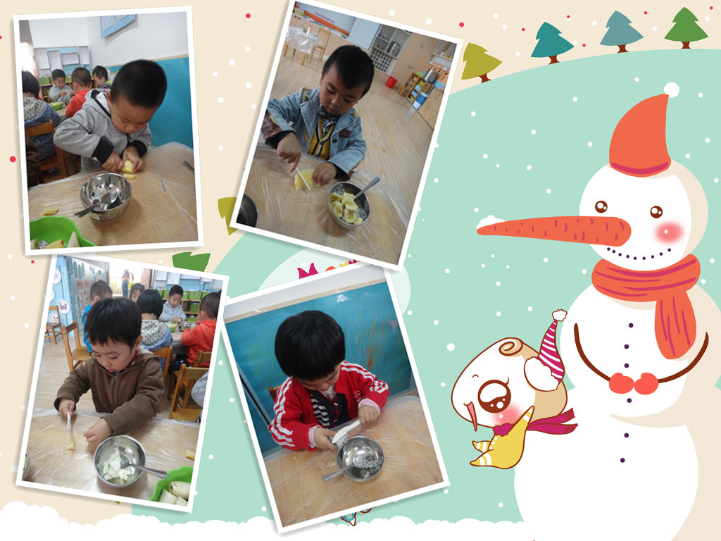 爸爸妈妈快来看,小朋友们都自己做水果沙拉啦!老师先把所有的水果洗好,分好!准备工作做好后,小朋友开始操作了,先用刀把香蕉切成小薄片,再把苹果梨子还有火龙果切成小四方块,(用刀的时候一定要小心呦!)然后把它们一起放在盘子里,最后放上沙拉酱用勺子搅拌均匀即可食用啦!