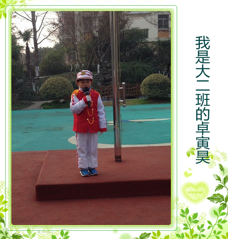 2015年12月14日上午,南京市翠屏山幼儿园举行了第十六周升旗仪式。8:30分升旗仪式正式开始。担任本周升旗手的是来自大一班的卓寅昊小朋友。他是一个大方有礼、积极主动的小朋友。 瞧,护旗手们伴随着激昂有力的出旗乐曲。在江老师的带领下大步向前走。他们别是大一班的黄子钦、大二班的张芷衡、大三班的严皓煊、大四班的赵辰欣、大五班的吴玥霖和大六班的钟沁伊。 国歌响起,鲜艳的五星红旗迎风飘扬,声声稚嫩的童声表达了孩子们对五星红旗的热爱和崇敬之情。 今天国旗下讲话的是高老师。小朋友们我们可以多做运动,多穿衣服来预寒保暖。 接下来是大班的每周之星。 然后是中班的每周之星。 最后是小班的每周之星。 |