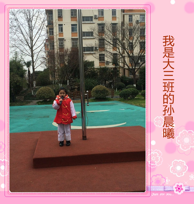 2015年12月28日上午,南京市翠屏山幼儿园举行了第十八周升旗仪式。8:30分升旗仪式正式开始。担任本周升旗手的是来自大三班的孙晨曦小朋友。她是一个活泼开朗、谦让有礼的小朋友。瞧,国旗下的她就像一名小军人一样 随后,江老师带领护旗手们托举着国旗铿锵走来。他们分别是大一班的黄子钦、大二班的张芷衡、大三班的严皓煊、大四班的赵辰欣、大五班的吴玥霖和大六班的钟沁伊。 一切准备就绪,随着国歌的奏响,五星红旗缓缓上升,全体师生目光齐聚,心情慷慨激动,眼神里透露出无以言说的自豪和对祖国深深的敬意。 今天国旗下讲话的是杨老师。2016年是猴年,祝所有的老师和小朋友们新年快乐! 接下来是大班的每周之星。 然后是中班的每周之星。 最后是小班的每周之星。 |