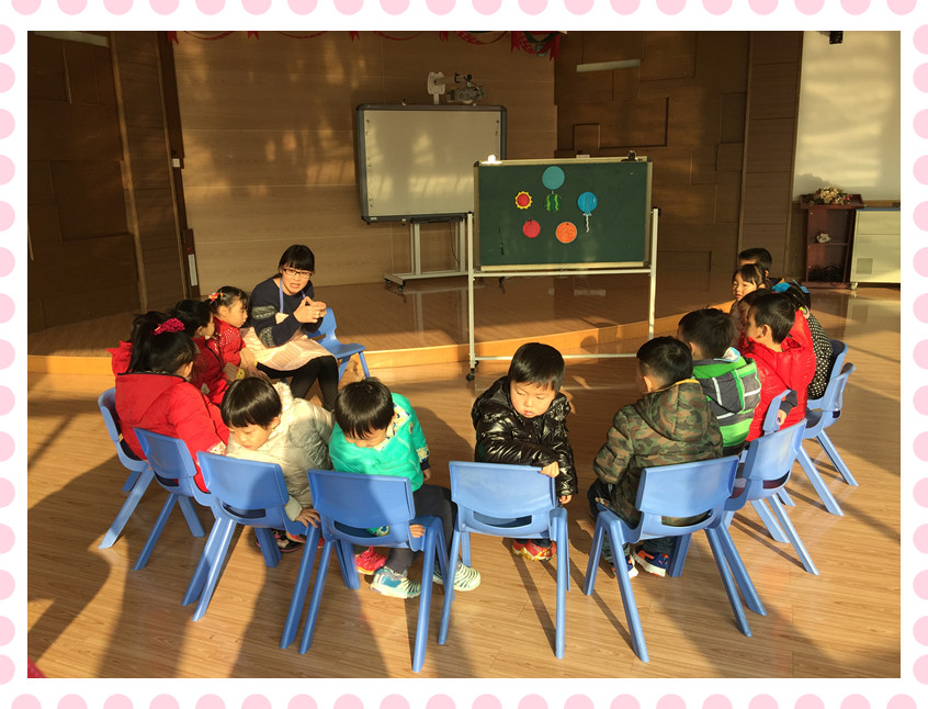 生活中哪里有圆形呢?语言组张文娟老师带孩子们联系生活经验,找到了生活中许多圆形:太阳是圆的、车轮是圆的、苹果是圆的……