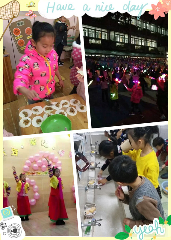 活动当天,各班围绕新年的主题,开展了形式多样的手工活动,如制作新年贺卡、红灯笼、鞭炮等,并用孩子的作品布置了活动室,营造了红红火火的新年气氛。下午,孩子们在喜庆的音乐声中,自己动手包水饺,忙得不亦乐乎。晚上,在霓虹闪烁的操场上,孩子们手舞荧光棒,开心的和老师、同伴一起载歌载舞,愉快的笑声响彻夜空,整个操场成了一片欢乐的海洋。紧接着,在幼儿园多功能厅内,“山东快书”、 “动感二人组”、“跆拳道”等精彩节目轮番上演,多才多艺的孩子们为我们带来了一台激情四溢的晚会。夜幕渐深,离开了爸爸、妈妈的孩子们,自己刷牙、洗脸……,在老师的故事声中,安然入睡。