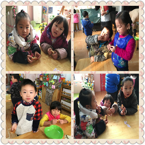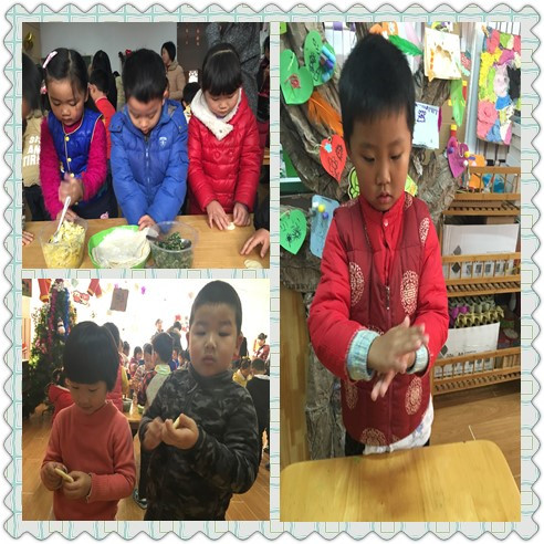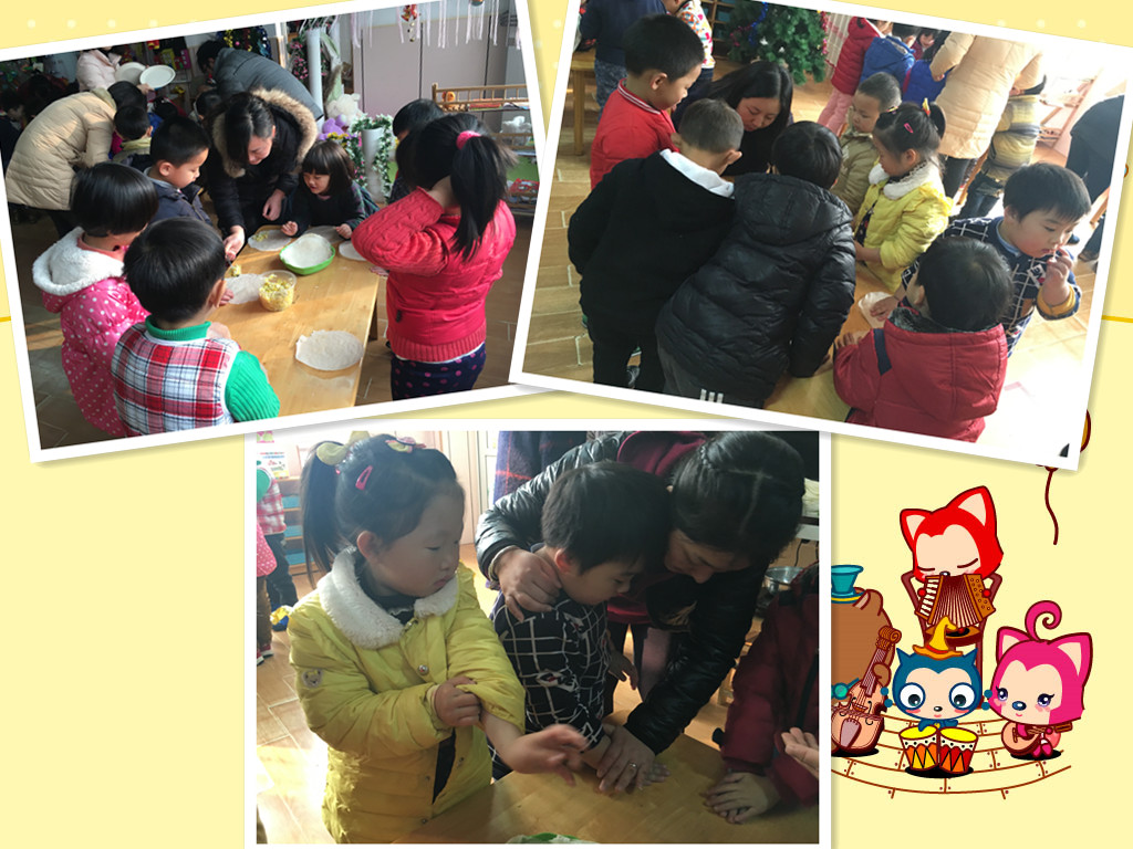 在小朋友和家长们的期盼中,12月31日,我们班组织了“元旦庆祝”活动。本次活动从上9:00开始,一直到11:00结束,我们将此活动与我国北方传统美食——油饼、春卷相结合,让小朋友们在认识、感知节日的同时,了解传统习俗,自己动手制作、品尝。也请到我们班的家长与小朋友们一起感受新年的节日气氛。