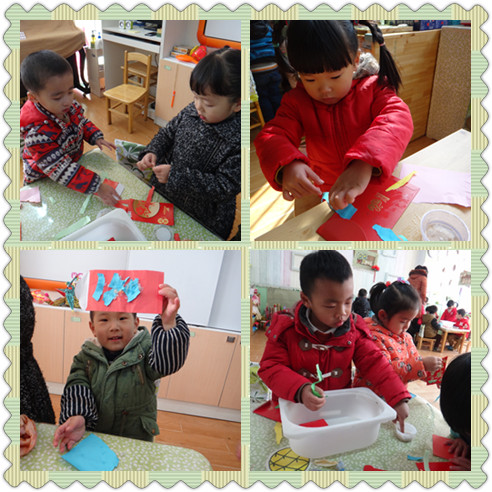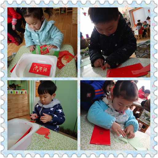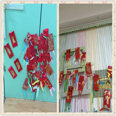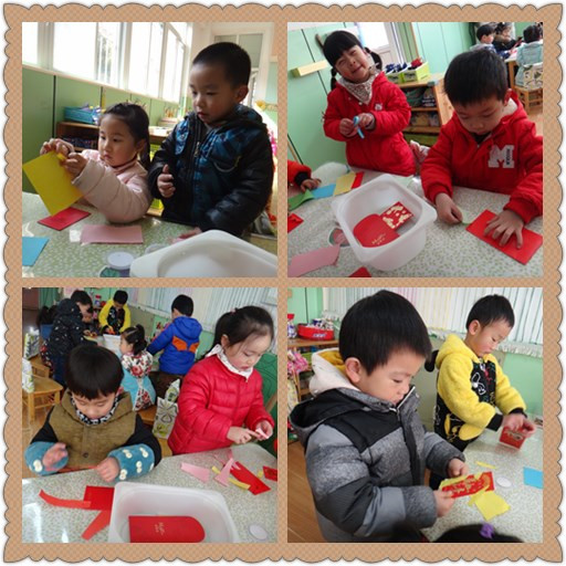 今天我们用自己带的红包做了红包娃娃,我们把各种颜色的纸撕成长条,用胶水粘一粘,然后贴在红包上面,当作红包娃娃的小手和小脚,你们看我们做的多认真啊!