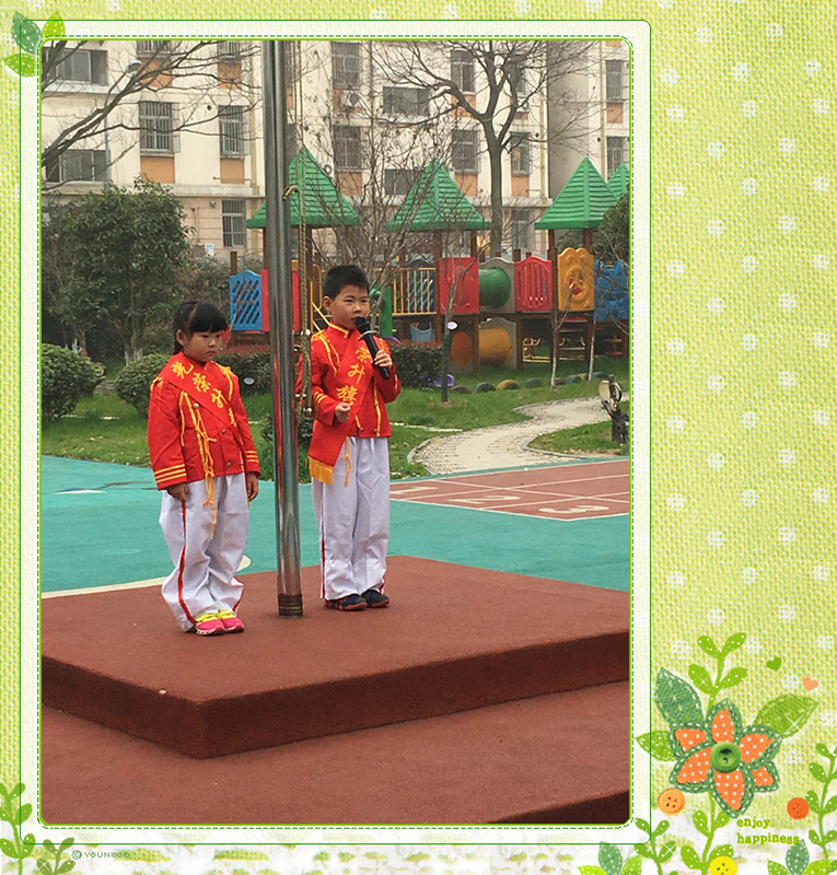 踩着隆隆的鼓点声,大二班的小旗手们英姿勃勃地走上升旗台,用骄傲的目光、笔挺的身姿欢送着鲜红的五星红旗冉冉升起,全园小朋友们齐唱国歌,歌唱祖国的繁荣富强! 大二班的小朋友给我们带来了很精彩的表演,学习雷锋热爱劳动,三月让我们爱满翠幼。