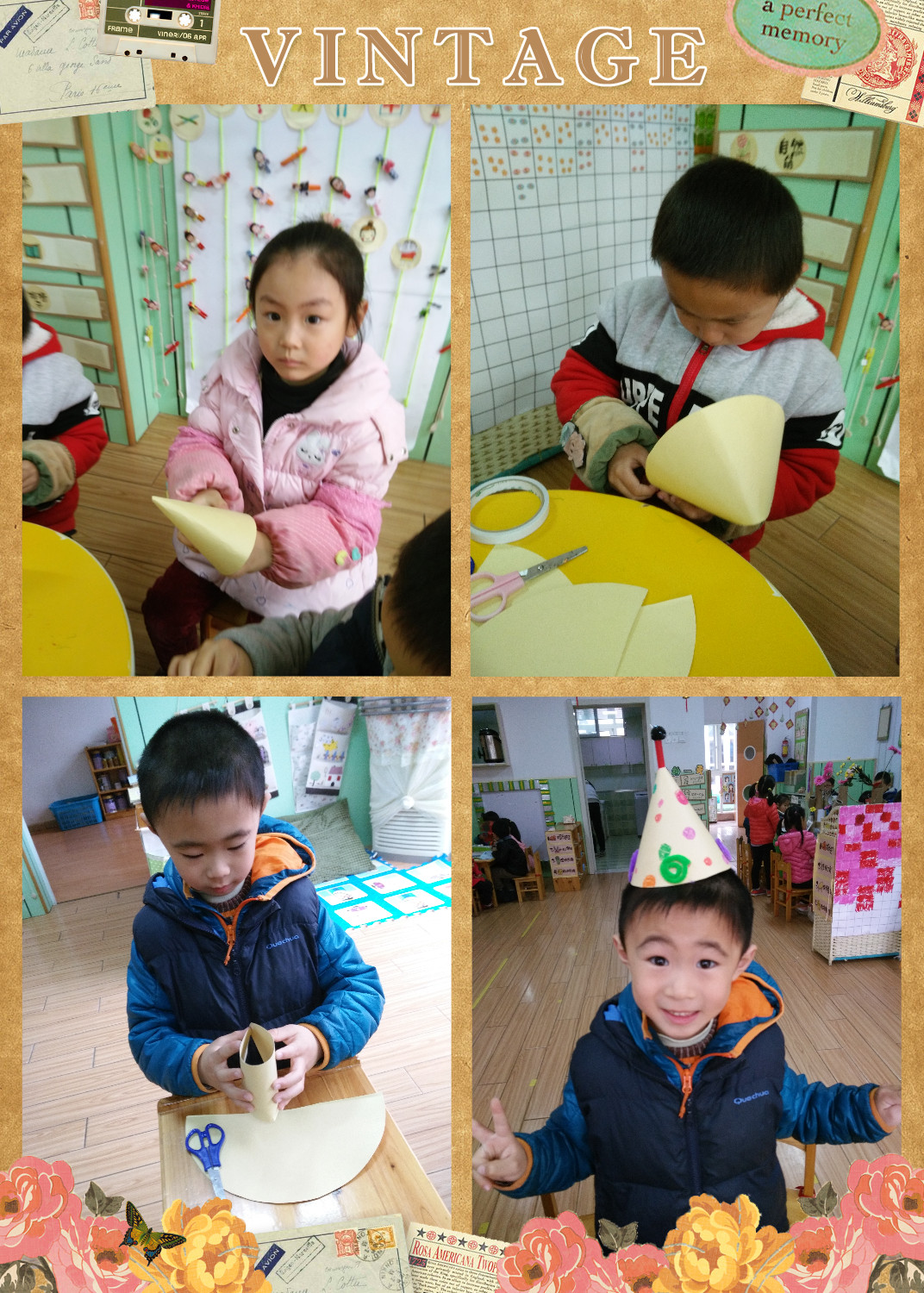 第四组小朋友用一个半圆形的纸装饰漂亮以后,一粘做成一顶生日帽。