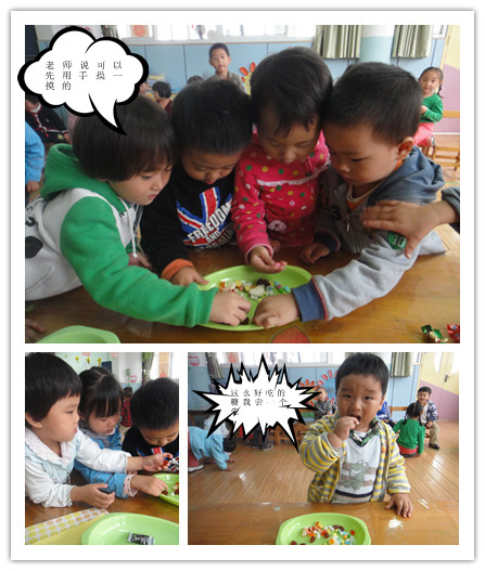 看过糖果了,也尝过味道了,接下来我们要齐动手喽,开始做糖果啦!爸爸妈妈,看我们做的多认真啊!