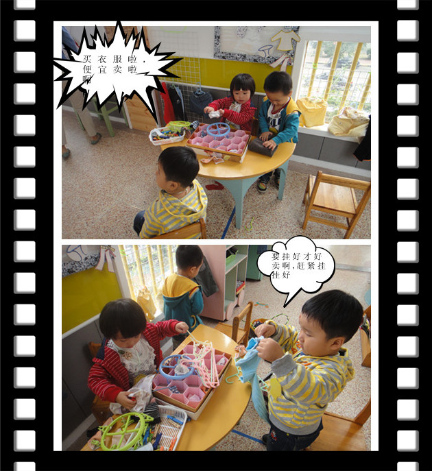 我在挂衣服、裤子呢!剩下来的衣服我要把它夹在架子上,这样才会有“爸爸、妈妈来买呢!”