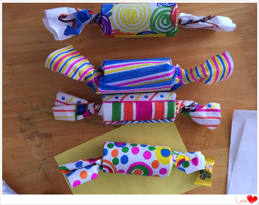 今天,我们自己尝试制作好吃的糖果,快来看!第一步,先在白色的纸上画上各种各样好看的图形;第二步,选择一个卷纸筒将白色的纸包裹在卷纸筒上;第三步,就是将两头的纸顺着一个方向拧一拧,这样中间的糖果就不会掉出来了。下面就来看一看我们制作的彩色糖果吧!
