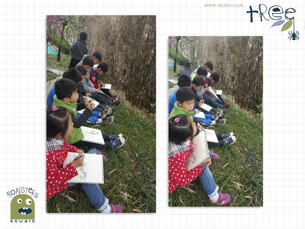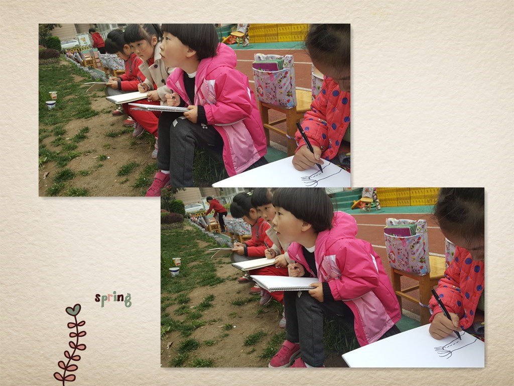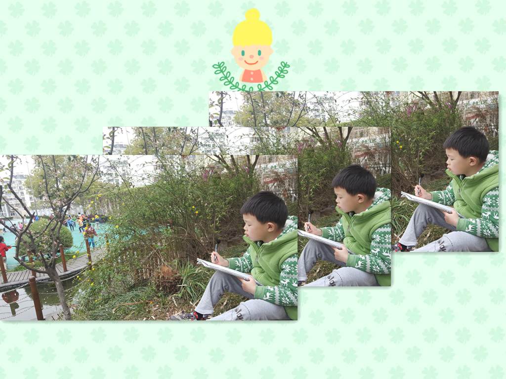 春日里的写生画 从词源的意义上说,“写生”一词是因为美术史上的五代“工画而无师,惟写生物”的腾昌祐到宋“写生赵昌”的历史发展,而获得了在品评上的意义。此后,凡是国画临摹花果、草木、禽兽等实物的都叫写生;摹画人物肖像的则叫写真,而与之相应的有“写心”和“写意”。历史上的画家重视读万卷书,行万里路,但不言写生,可是,生活对于画家的艺术发展却有着一定的影响,即使在复古风盛行的清初,像“四王”辈的画家也经常策杖于山林,扁舟于江湖,在他们所题“临”、“摹”、“仿”、“抚”某家的画面上,依然透露出在生活中所见的山川气象。 在经过《瓶花》写生课之后,孩子们对户外写生产生了浓厚的兴趣,于是在一个温暖美好的午后,我们趁着春日里明媚的阳光来到了小花园进行户外写生活动,将春色尽收画纸。