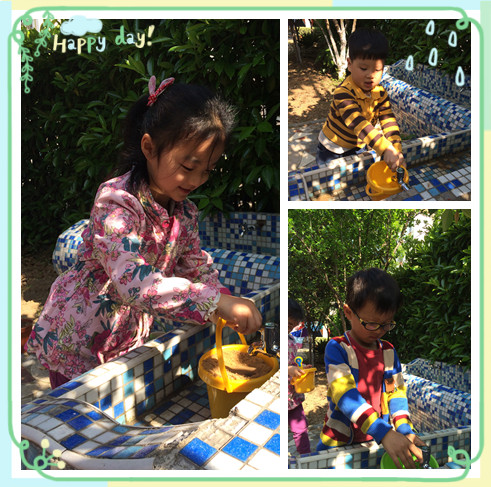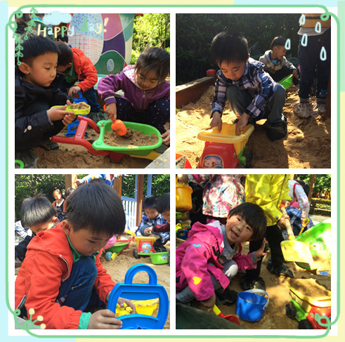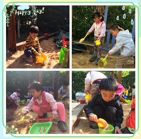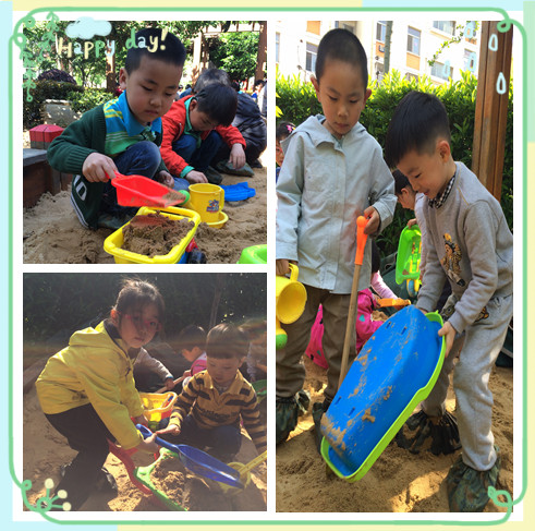 今天下午安排的活动是玩沙,孩子们别提有多高兴了,我预先为孩子们准备好了沙具和鞋套。孩子们都能有序地取沙具,然后来到沙池旁开始自主玩了起来。有的单独玩耍,有的自由结伴玩。他们有的用铲子铲,堆成了一座小山状;有的在专注地挖“宝藏”,当找到了“宝贝”时,都高兴地跳了起来;有的用枯树枝在沙中作画,画了可爱的孩子手拉手……