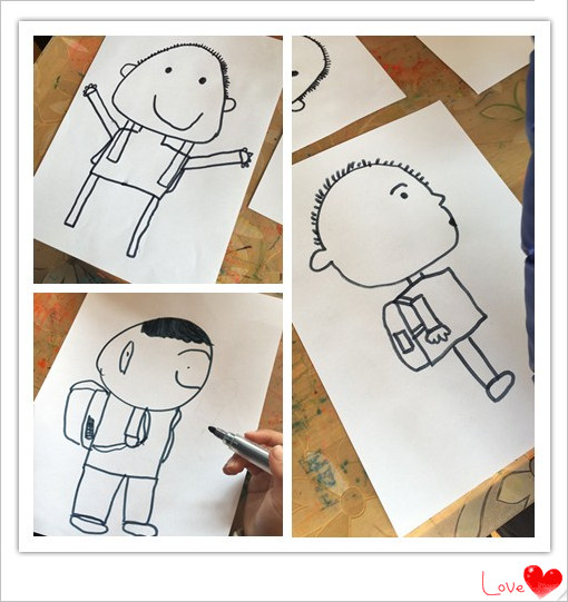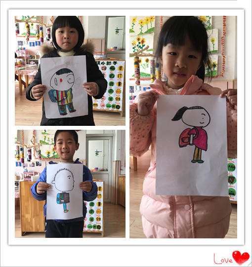 今天,我们上了一节美术活动:背书包的小学生。还有最后一学期,我们就要离开幼儿园,投入小学的怀抱,成为一名光荣的小学生。听说小学的哥哥姐姐们每天都要背书包呢!今天我们就来画一画,背书包的小学生正面,侧面和背面,有一点难度哦。爸爸妈妈们快来看看我们画得怎么样吧!