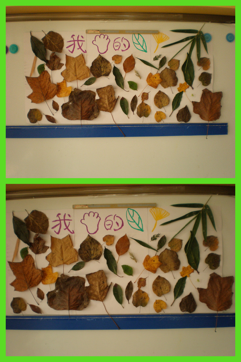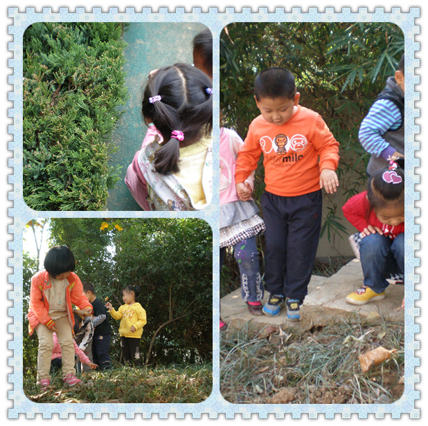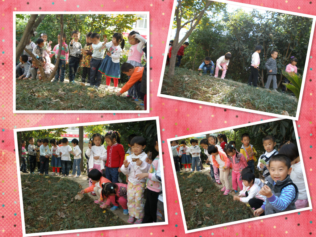 看!我们捡了好多树叶哦。捡树叶时,我看到了,有的树叶宝宝会离开大树妈妈,因为他们是“落叶树”,比如:梧桐树、紫荆树、银杏等等;有的树叶宝宝不会离开大树妈妈,他们是“常青树”,如“松树、香樟树等等。我还观察到了,原来树叶长得是不一样的,树叶有椭圆形的,有针形的,有披针形的,有掌形的,有扇形的,还有心形的等等,你看到了吗?
