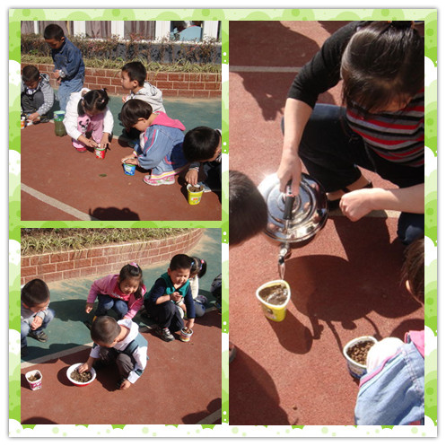 我们都知道了种子生长发育需要泥土、水、阳光、空气,那怎样种蚕豆呢?先将土放在种植盆中,然后用小铲子挖一个小洞,放进3——5粒蚕豆,然后用泥土盖上,浇上水。看看我们大家种植的蚕豆吧!