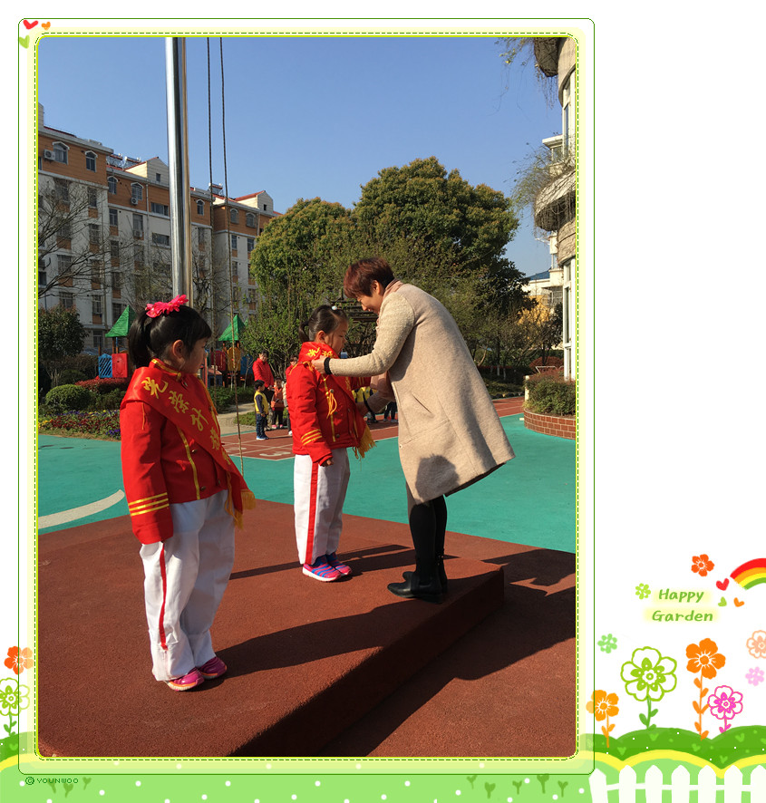 园长妈妈正在给升旗手们佩戴光荣的绶带。