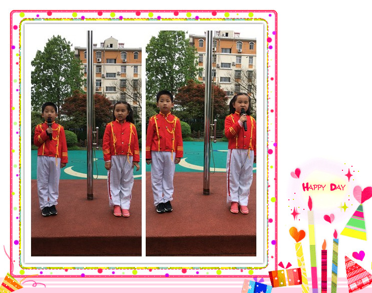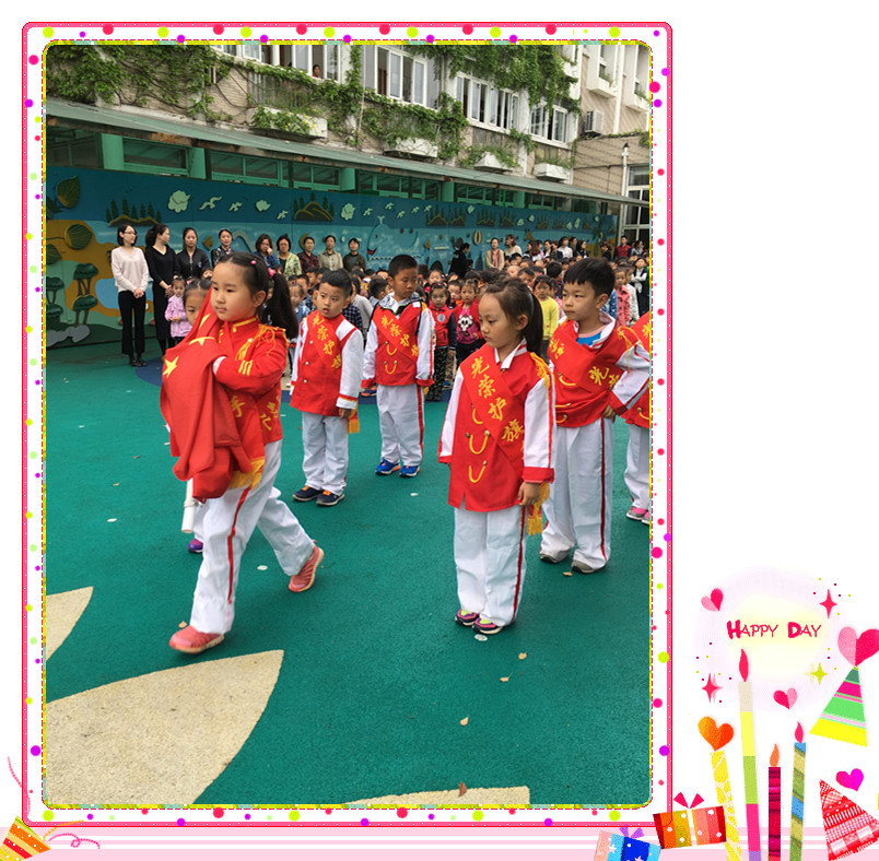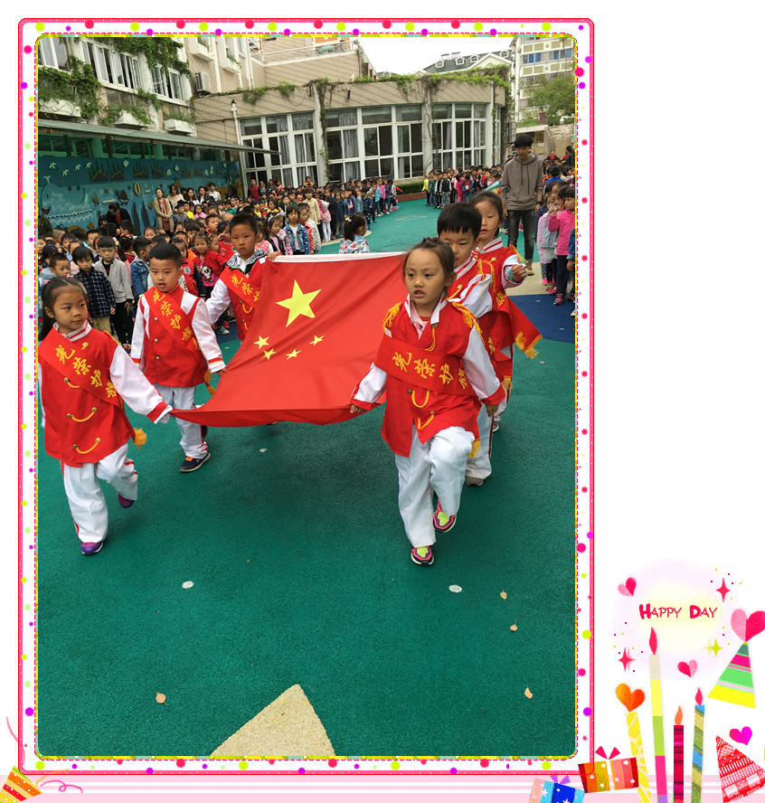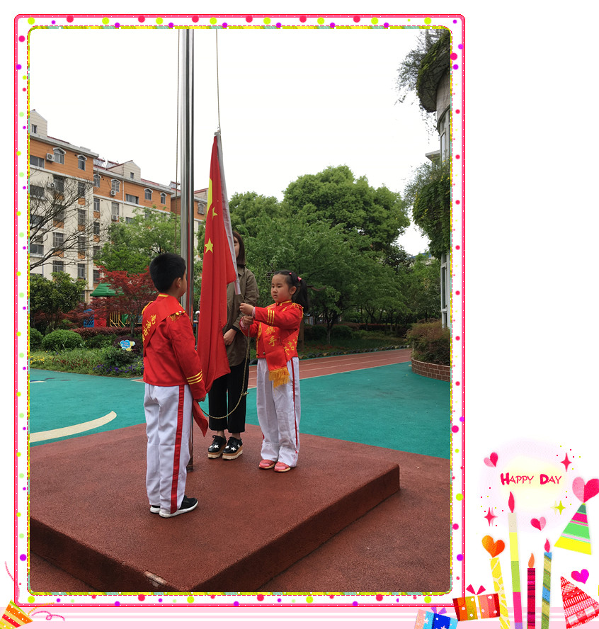 开场前,六位升旗手护卫着鲜艳的五星红旗在安静地等候着。升旗仪式正式开始,伴随着激昂有力的出旗乐曲,六位升旗手护卫着国旗,步履轩昂大步向前走,神气活现,赢得了老师、家长和小朋友们赞赏的眼光。