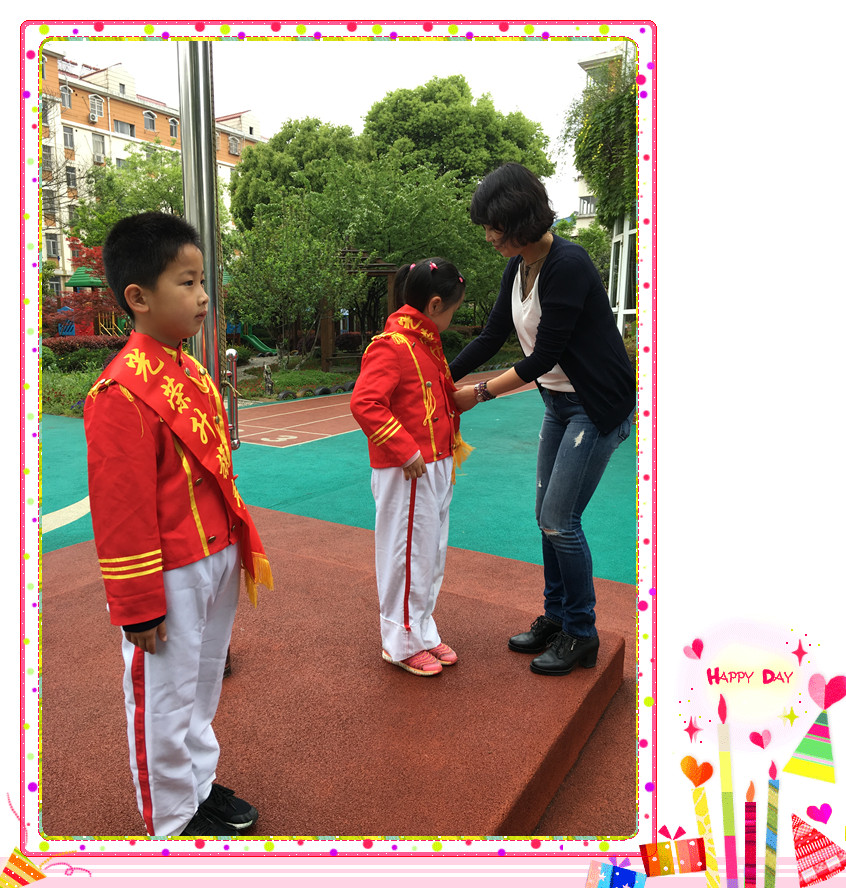 园长妈妈正在给升旗手们佩戴光荣的绶带。