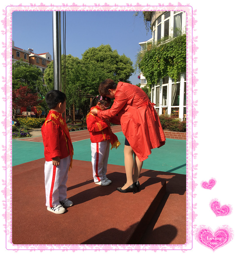 亲切的园长妈妈正在给两位升旗手佩戴光荣的绶带!