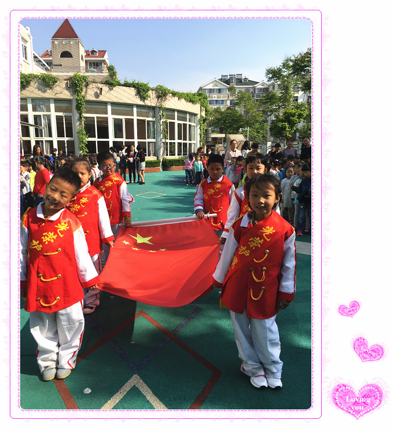 国歌响起,升旗手有节奏地拉着升旗绳,鲜艳的五星红旗徐徐升起,全场的小朋友们注视着国旗,满脸认真的表情。